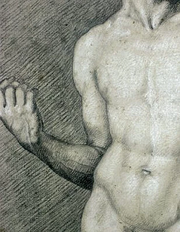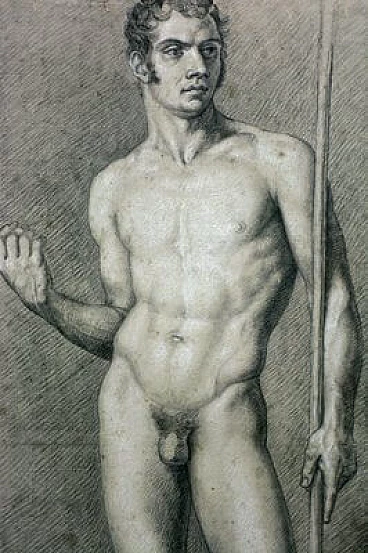 Studio di nudo maschile, carboncino e matita su carta con cornice, inizio '800
