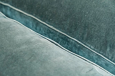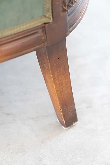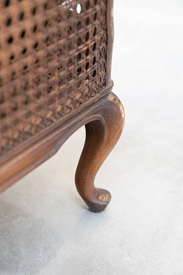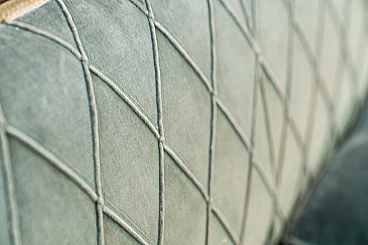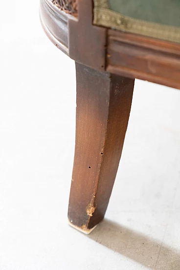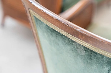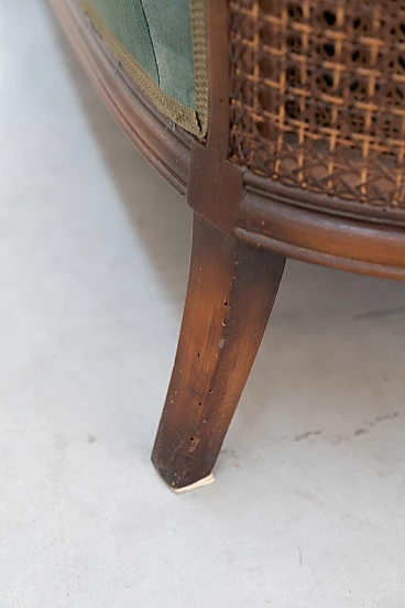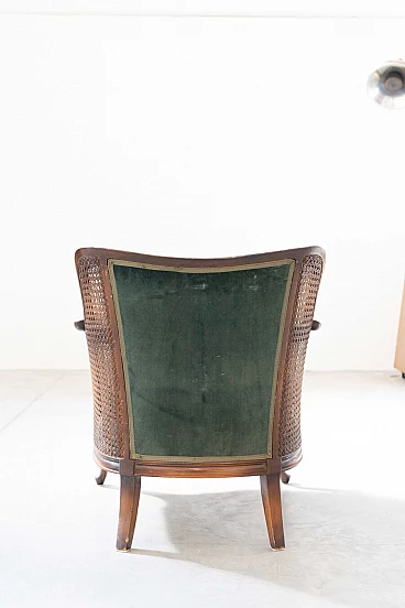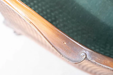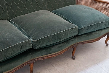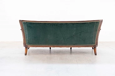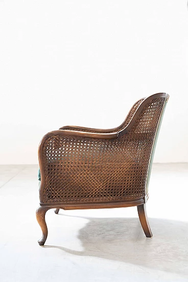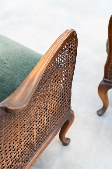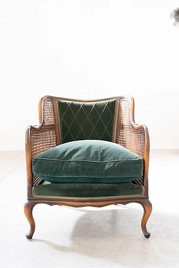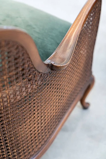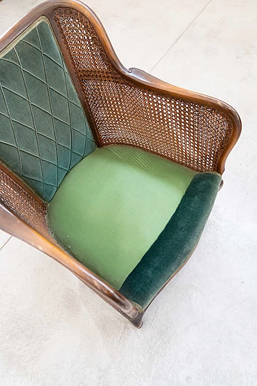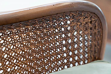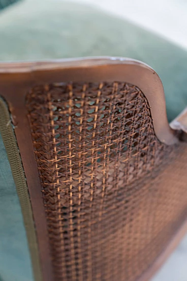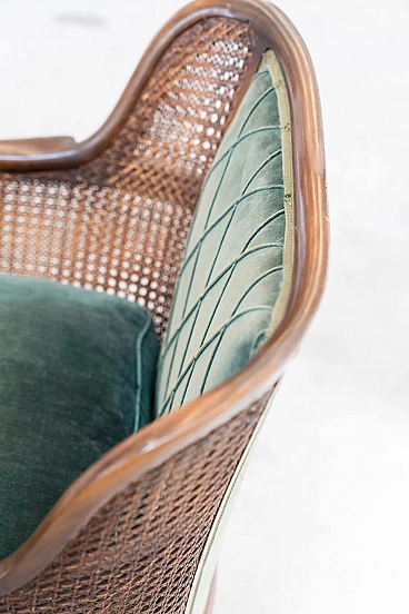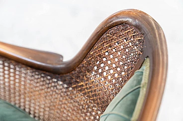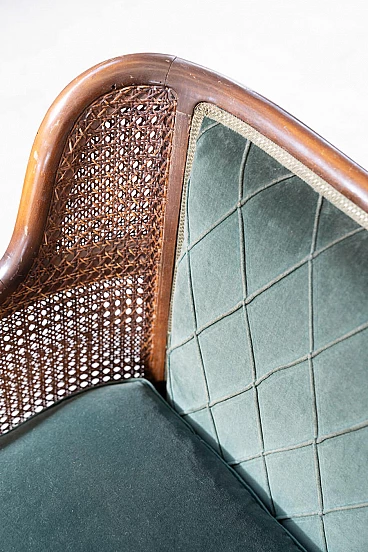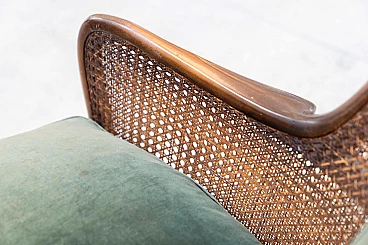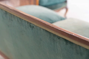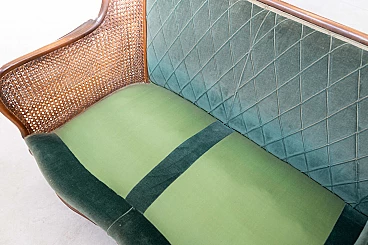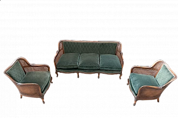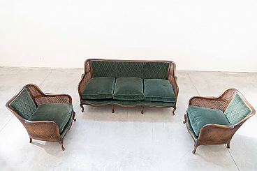 Divano a tre posti e coppia di poltrone in paglia di Vienna e velluto verde con rilievi, anni '50