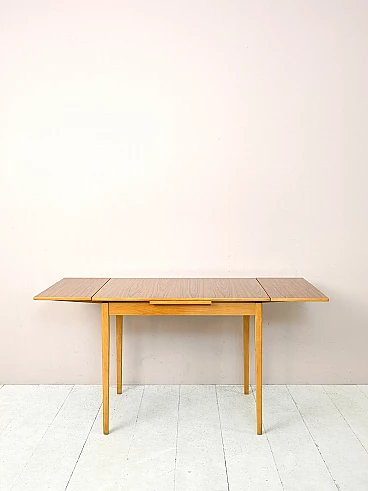 Tavolo scandinavo allungabile in betulla con piano in formica, anni '60. Si distingue per il piano in formica effetto legno che lo rende molto resistente senza dover rinunciare allo stile. Grazie alla presenza delle assi laterali estraibili può essere allungato all'occorrenza. Le gambe squadrate sono in legno chiaro e rendono la struttura leggera e moderna. Dimensioni delle assi: 2 x 27 cm. È stato fatto un restauro conservativo con prodotti di origine naturale. Può presentare segni del tempo.