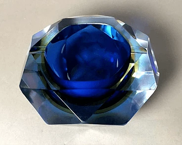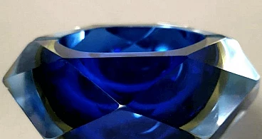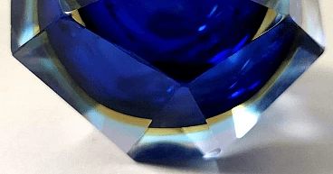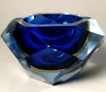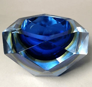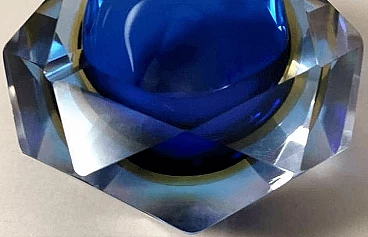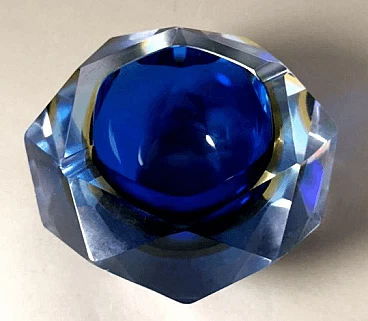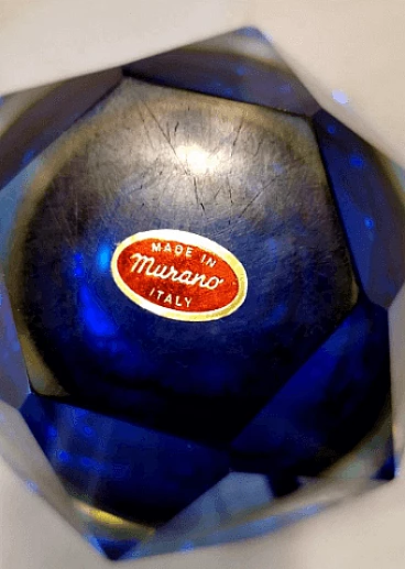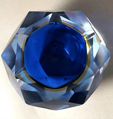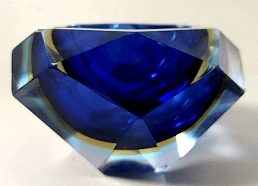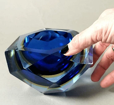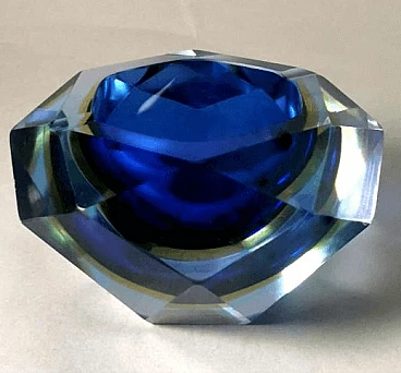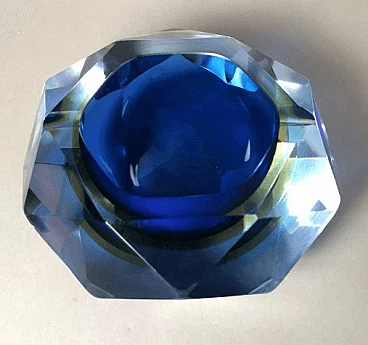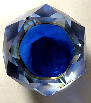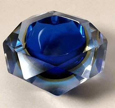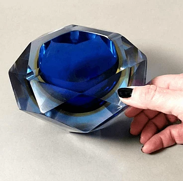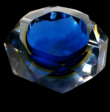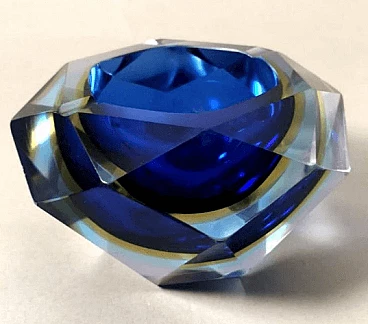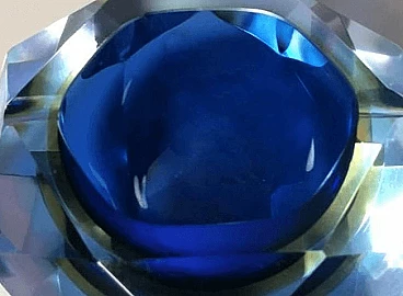 Posacenere massiccio in vetro di Murano caratterizzato da tagli netti e decisi e bordi molto accentuati. Il colore è un eccezionale blu cobalto con sfumature di blu ottenute con ossido di cobalto e una piccola quantità di ossido di rame. Il posacenere è stato creato tra il 1964 e il 1968 in una piccola fornace a Murano gestita da ex maestri vetrai della ditta Mandruzzato, i quali hanno realizzato il posacenere seguendo lo stile proprio dell'azienda e utilizzando appunto la tecnica del vetro "sommerso". Questo nasce a Murano alla fine degli anni '30 ma diventa popolare negli anni '50 grazie all'abilità e all'inventiva dei maestri muranesi. La tecnica del vetro "sommerso", partendo da un vetro soffiato o pieno, permette di ottenere più strati sovrapposti di colori diversi con effetti cromatici suggestivi; questo è possibile immergendo il vetro in lavorazione in crogioli di colori diversi. In questo caso quindi il vetro trasparente uscito dal forno è stato posto in un unico crogiolo contenente, come già detto, ossido di cobalto e rame, che hanno dato al vetro questo bellissimo e suggestivo colore. L'operazione non è semplice e viene eseguita solo da maestri vetrai di grande esperienza. Dopo questo passaggio, il maestro vetraio, aiutandosi con appositi utensili lisci, ha dato la forma lineare e geometrica al posacenere, che una volta raffreddato è passato alla delicata fase di spianatura e lucidatura a mano, operazioni che hanno permesso alle superfici di essere perfettamente appiattite, levigate e lucide. L'azienda Mandruzzato è una rinomata vetreria con sede a Murano ed è nota per le sue pregiate creazioni in vetro, tra cui i posacenere. Questi sono realizzati utilizzando le tradizionali tecniche di soffiatura del vetro perfezionate da generazioni a Murano; sono caratterizzati da colori vivaci, motivi geometrici audaci, accattivanti combinazioni cromatiche e lavorazione di alta qualità. Ogni posacenere è un'opera d'arte unica, che mette in mostra l'abilità e la creatività degli artigiani. Gli artigiani della piccola fornace muranese hanno saputo padroneggiare con maestria le tecniche e l'uso dei colori, creando un oggetto che crea un bellissimo gioco di luci.