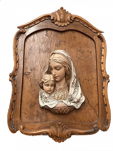 Capoletto in maiolica dipinta raffigurante Madonna con Bambino in cornice di noce, anni '50