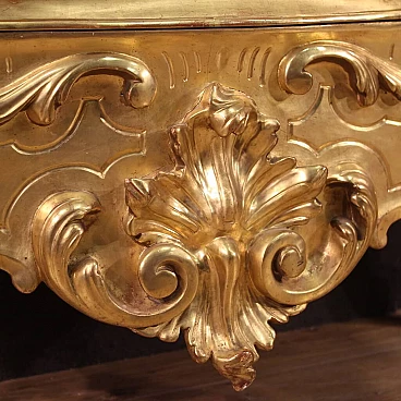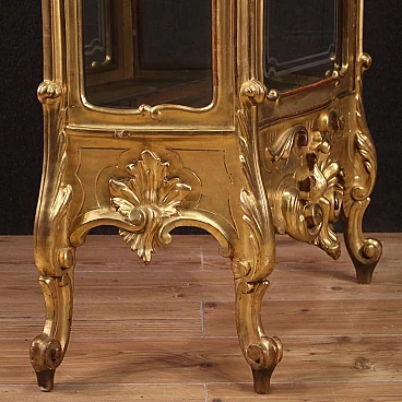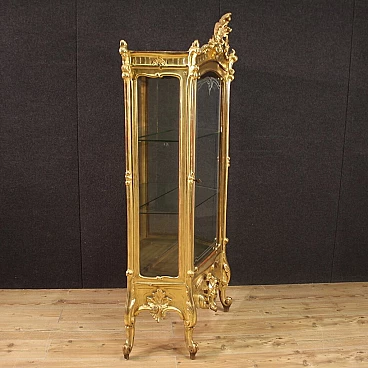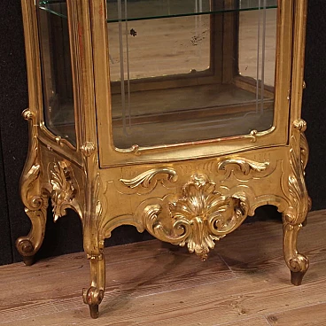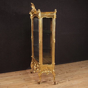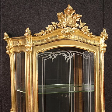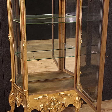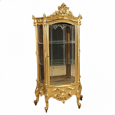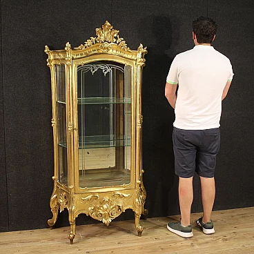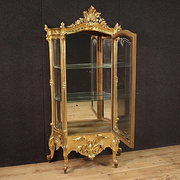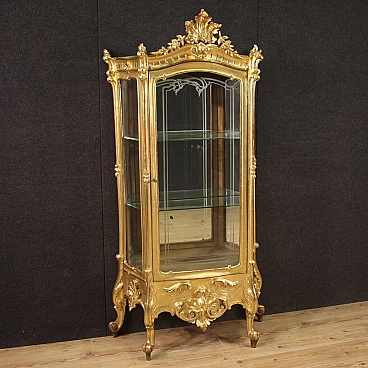 Vetrina italiana della fine del XIX secolo. Mobile in legno e gesso finemente scolpito e dorato di bella linea e piacevole arredamento. Vetrina ad un'anta munita internamente di due ripiani in vetro (più piano a basamento) e fondo a specchio (non originale, sostituito nel corso del XX secolo, vedi foto). Mobile di buona capacità e servizio, ideale per esporre collezioni di oggettistica. Vetrina da salotto o studio, di bella decorazione, sorretta da quattro solide gambe adornate da piedini a ricciolo (vedi foto). Anta e fianchi completi di vetri incassati. Mobile di grande impatto ed eleganza, con qualche piccolo segno del tempo. Vetrina strutturalmente sana, completa di una chiave funzionante, nel complesso in buono stato conservativo.