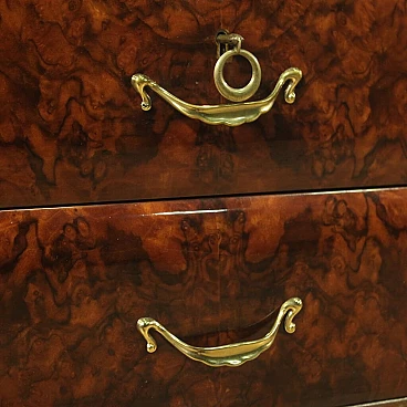 Cassettiera con specchio, anni '50. Struttura scolpita e impiallacciata in noce, radica e legni da frutto. Piano in vetro dipinto, secondo ripiano più piccolo in vetro trasparente. Munita di sei capienti cassetti adornati da maniglie in ottone dorato. Completa di tre chiavi funzionanti che permettono la chiusura della fascia di cassetti più alta (vedi foto). Specchiera originale perfettamente riflettente adornata da bordura dipinta e decoro dorato in alto (vedi foto). Strutturalmente sana, presenta piccoli segni di usura (vedi foto). Smontabile in due elementi (specchio e cassettiera) per facilitarne lo spostamento e l'inserimento in casa.