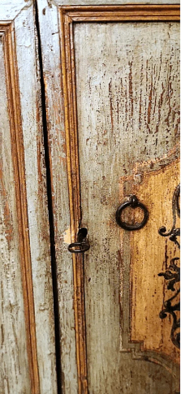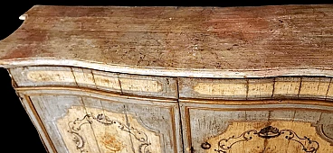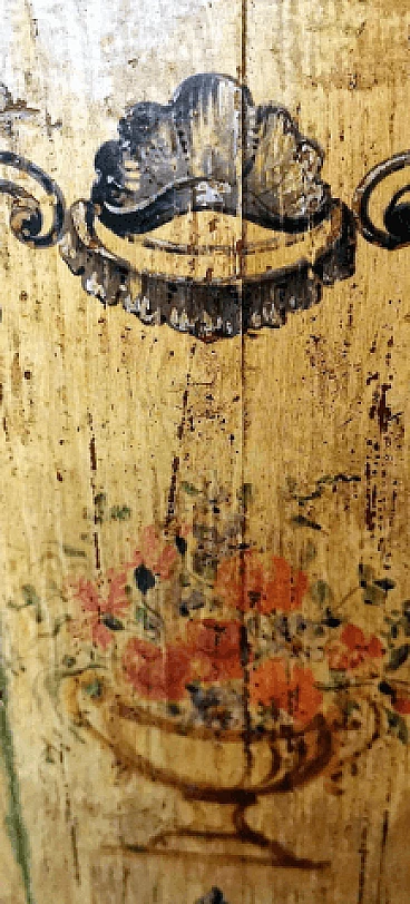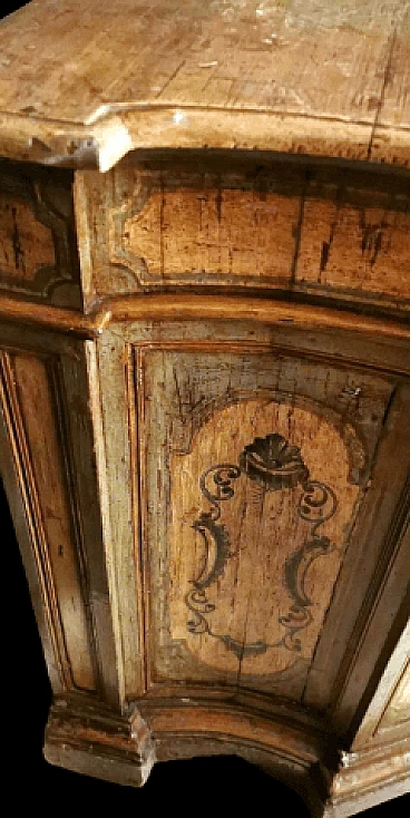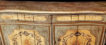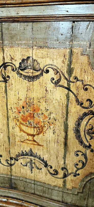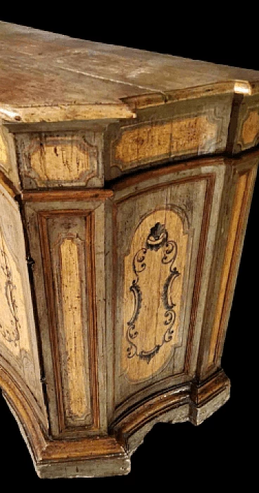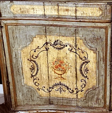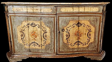 Credenza Luigi XIV veneziana in legno laccato e dipinto realizzata tra fine '600 e inizio '700. L'articolo verrà fatto visionare presso la Soprintendenza alle Belle Arti di Firenze, così sarà ancor più impreziosito dal Certificato della prestigiosa sede di Firenze. Importante e rara credenza veneziana laccata e dipinta. Il mobile ha una forma trapezoidale ondulata ed elegantemente dentellata, presenta due grandi ante che, una volta aperte, rivelano un ampio spazio interno diviso da un tramezzo verticale e da due piani orizzontali; questa suddivisione è stata realizzata in epoche successive così come l'intero rivestimento interno per il quale è stato utilizzato un tessuto giallo. L'esterno nella parte superiore presenta un piano costituito da un unico pezzo sagomato con linee morbide e raffinate. L'intero mobile e la solida base seguono il profilo ondulato del piano conferendo alla credenza leggerezza e delicatezza. La squisita laccatura originale ha colori tenui e delicati; le raffinate e aggraziate decorazioni floreali delle ante si ripetono anche nei fianchi concavi producendo un effetto mosso ed estremamente raffinato. Il mobile, realizzato in legno tenero, probabilmente abete rosso, è in patina con i ferri originali dell'epoca. È stato realizzato tra il 1695 e il 1710 in una bottega artigiana di falegnameria a Venezia. Infatti, i mobili laccati veneti venivano prodotti principalmente nella città lagunare, che è stata un importante centro di produzione di questo tipo di mobili durante il periodo Rinascimentale e Barocco. Le botteghe degli artigiani veneziani erano famose per la loro maestria nella creazione di mobili laccati di alta qualità, come armadi, credenze, scrivanie e tavoli. Questi mobili venivano spesso realizzati su commissione per nobili, aristocratici e chiese, e venivano utilizzati per abbellire palazzi e residenze prestigiose. La fine del '600 e l'inizio del '700 sono caratterizzati dall'opposizione tra il freddo, opulento rigore del tardo Manierismo e il Barocco più grandioso e stupefacente, che stava emergendo. I mobili, pur rimanendo saldi nella loro tradizione, risentono del declino dei caratteri di sobrietà ed equilibrio che avevano dato all'Europa la misura del Rinascimento. Le linee dei mobili sono sobrie e diritte ma tendono gradualmente ad ammorbidirsi. I caratteri dell'utilità cedono di fronte al valore sempre più importante della decorazione. Una delle caratteristiche più importanti del mobile italiano di questo periodo è l'arte della laccatura, conosciuta e praticata in Estremo Oriente da cinesi e giapponesi fin dai tempi più antichi. L'Europa iniziò a interessarsene solo all'inizio del '600. Le lacche sono composte da varie essenze, resine miste e vari oli. In Francia, in Italia o in Inghilterra le lacche non sono mai dure come quelle orientali. Questa diversità consiste principalmente nella preparazione con gesso e colla. In Italia il legno preferito dai laccatori è il cirmolo, che ha la caratteristica di essere leggero, morbido e si presta docilmente a tutti gli adattamenti stilistici che contraddistinguono l'epoca. Il legno veniva lasciato ben stagionato e tagliato in solidi listelli ricurvi che sovrapposti creavano il fusto del mobile, destinato poi ad essere inviato al laccatore per la decorazione. Le superfici da decorare dove si erano verificate eventuali aperture e crepe, dovute a sbalzi di temperatura o per altri motivi, venivano ricoperte con una striscia di tela incollata. Lo stelo del mobile veniva poi nuovamente intonacato ovunque con uno strato di colla in modo che il legno potesse assorbirlo, chiudendone i pori; poi venivano dati più strati di intonaco e colla fino ad ottenere una superficie omogenea, che veniva lisciata con carta vetrata finissima. Questa è la tecnica di preparazione dei mobili veneziani, che hanno una copertura di stucco e colla molto spessa rispetto a un paio di strati dei mobili laccati genovesi, piemontesi e di altre regioni italiane. Terminata la preparazione dell'intonaco, si dava uno strato di fondo o di colore con la tempera, dopodiché si procedeva alla decorazione vera e propria. Terminate questa e la doratura, venivano passati più strati di vernice sandracco, cioè un complemento gommoso alla vernice, che con il suo caratteristico colore paglierino modificava cromaticamente la laccatura. A seconda degli strati di questa vernice si poteva ottenere una tonalità calda e trasparente; ad esempio un giallo particolare si otteneva passando la sandracca su fondo bianco, e il classico verdastro era il risultato di uno o più strati, a seconda dell'effetto desiderato, su fondo azzurro. I mobili laccati erano un privilegio delle classi abbienti e a Venezia i grandi pittori dell'epoca (Guardi, Tiepolo, Zuccarelli e Zais) ricevettero commissioni per decorare appartamenti e di conseguenza creare cartoni mobili laccati. Questi mobili erano molto apprezzati per la loro bellezza e venivano utilizzati come mobili di pregio nelle residenze aristocratiche dell'epoca. La credenza si presenta in buone condizioni originali e non ha subito grandi restauri, solo ritocchi o piccole riparazioni all'interno.