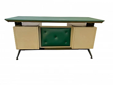 Bella scrivania industriale anni '50, con struttura in metallo, piano e fronte in capitonne in sky verde. A sei cassetti