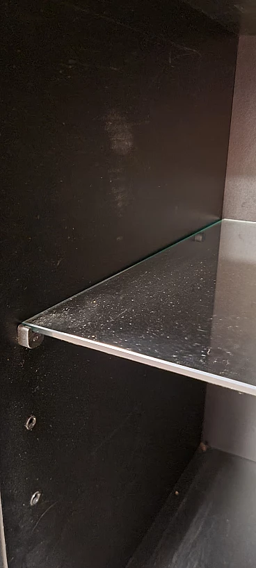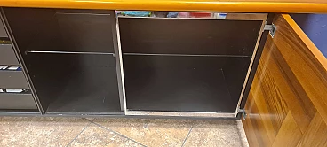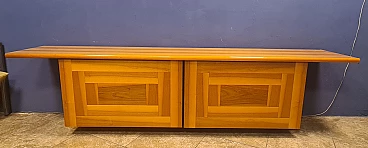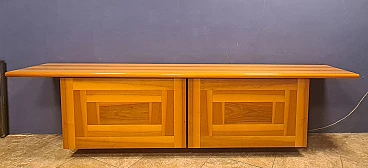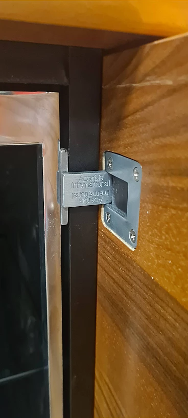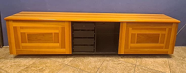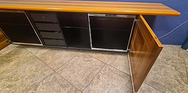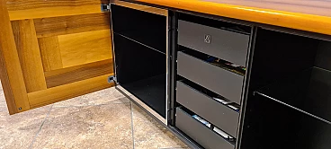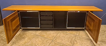 Credenza Sheraton di Giotto Stoppino e Lodovico Acerbis per Acerbis, anni '70 (1977). Modello vincitore del Compasso D'oro nel 1979, il cui logo è presente sulla credenza stessa. Nel 1984 viene esposta a Tokyo alla mostra "Mobili di design dall'Italia". Credenza qui proposta in laminato e legno impiallacciato di noce tanganica; rara in questa versione con il legno a vista. Il mobile presenta due ante scorrevoli che scoprono la parte centrale dove vi sono quattro cassetti e due ripiani in vetro. La particolarità del design sta proprio nelle ante che a metà apertura da scorrevoli diventano apribili lateralmente rivelando quattro ulteriori ripiani in vetro. Originale in tutte le sue parti, presenta piccoli e lievi inevitabili segni del tempo (vedi foto).