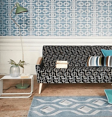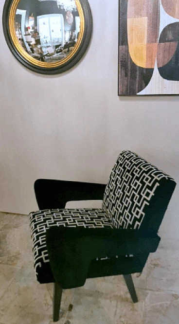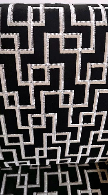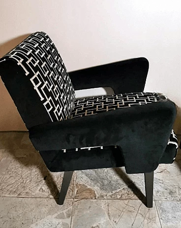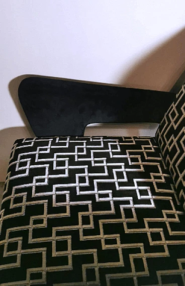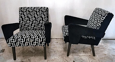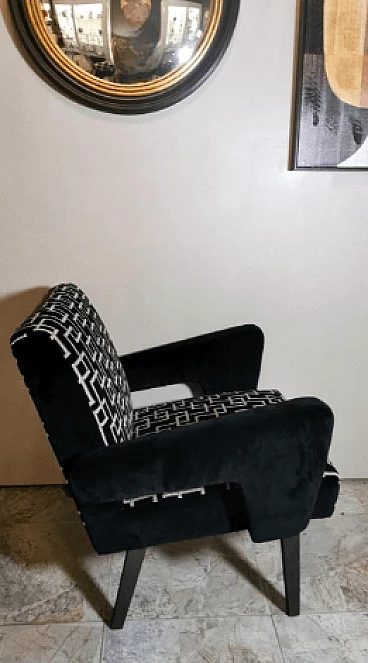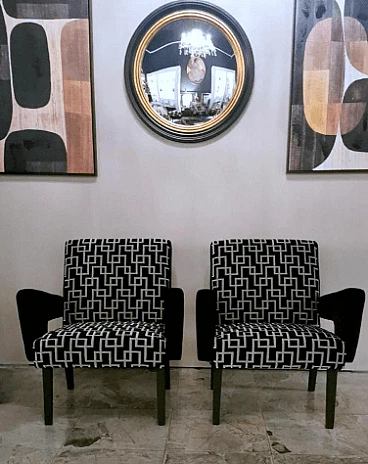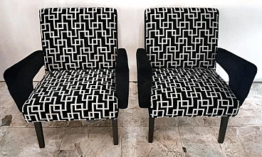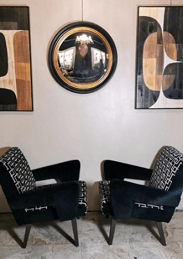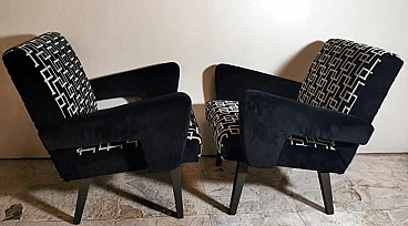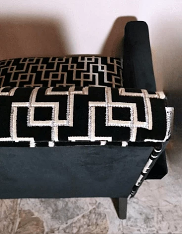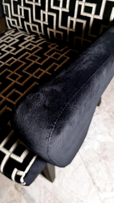 Elegante e raffinata coppia di poltrone. La robusta struttura è in legno, le gambe sono verniciate di nero; la seduta è ampia e comoda anche grazie alla particolare forma dei due grandi braccioli. Sono state realizzate tra il 1960 e il 1965 tra Meda e Mariano Comense in Brianza, una prolifica area industriale e artigianale della Lombardia, dove c'è un'alta produzione di mobili di design realizzati con grande maestria. Le poltrone sono state restaurate e rivestite con l'iconico e sofisticato velluto di Designer Guild con motivo "Janneret" con taglio geometrico e linee a incastro; uno dei tessuti più popolari dell'azienda (vedi foto originale del set del marchio). L'intera opera è stata realizzata a mano con maestria e precisione da un vecchio maestro artigiano di Prato (Italia). Ricordiamo che la città di Prato è considerata il più grande polo tessile del mondo, i suoi artigiani e le sue aziende, altamente specializzate, sono un punto di riferimento per creatività, qualità ed eccellenza. Designers Guild, fondata nel 1970 da Tricia Guild, è un'azienda internazionale di casa e lifestyle, con sede e showroom a Kings Road e Marylebone High Street a Londra e negozi propri in tutto il mondo. Realizza tessuti e carte da parati di grande impatto decorativo in cui colore e classicismo vengono reinventati e reinterpretati in chiave attuale. Altezza della seduta: 43 cm.