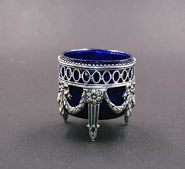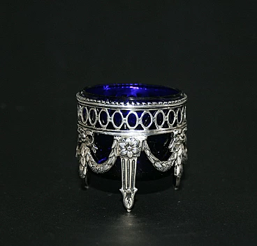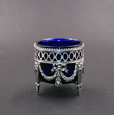 Saliera in argento e vetro blu in stile Luigi XVI, anni '30