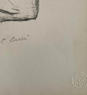 Carlo Carrà (Quargnento, Alessandria 1881- Milano 1966), artista poliedrico, comincia la sua attività di disegnatore a soli 12 anni. Nel 1906 studia all’Accademia di Brera sotto la guida di Cesare Tallone, qui entra in contatto con Umberto Boccioni. Carrà aderisce dapprima al Divisionismo e successivamente al Futurismo firmando nel 1910 il Manifesto dei futuristi e il Manifesto tecnico della pittura futurista. Nel 1916 si avvicina alla pittura metafisica di Giorgio De Chirico ma sarà soltanto dal 1919 che comincerà il rinnovamento del suo stile verso quel “realismo” che lo porta alla semplificazione delle forme e delle composizioni. La produzione grafica di Carrà è strettamente legata alla sua pittura e le piccole lastre tra cui La spiaggia di Moneglia e Vele al chiuso del 1923 sono considerate le più riuscite. Dal 1941 è titolare della cattedra di pittura presso l’Accademia di Brera. Nel foglio, noto anche con il titolo Nudo femminile, l’artista rappresenta una donna monumentale che come una Venere sorge dall’acqua. La figura statuaria colta intera mentre procede verso destra, è raffigurata nuda, si staglia tra un cielo scuro e la linea dell’orizzonte marino appena accennata. Capelli bagnati scendono sulla nuca con una mano cerca di portarli dietro l’orecchio; questo gesto così semplice e intimo stride con l’aspetto androgino e gigante della figura. L’uso della litografia è dettata dalla ricerca di atmosfere delicate sublimando la realtà in un luogo mistico, in un tempo eterno. Foglio numerato a matita in basso a sinistra: 48/100 e firmato a matita: C. Carrà. Timbro a secco della Libreria Prandi, Reggio. Tiratura in 100 esemplari, più tre esemplari di prova. Il foglio appartiene alla cartella Segreti pubblicata dalle Edizioni della Colomba di Milano, 1944, a cura di G. Geogerino e A. Sassu. La lastra è stata successivamente cancellata. Si conoscono due disegni preparatori datati rispettivamente 1942 e 1943. Impressione eccellente. Ottimo stato di conservazione.
