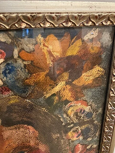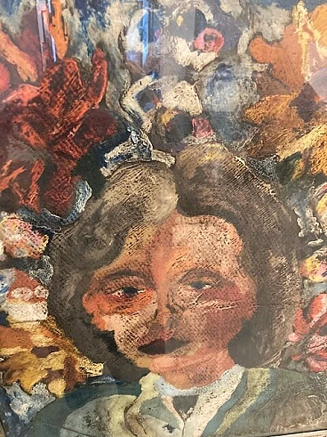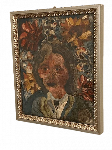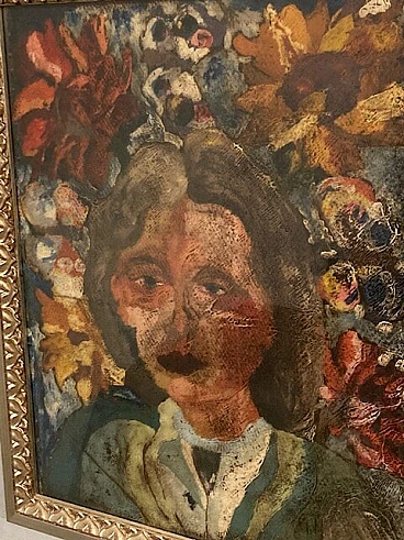 Giuseppe Serafini, volto di ragazza e fiori, dipinto a olio su cartone, anni '60
