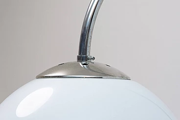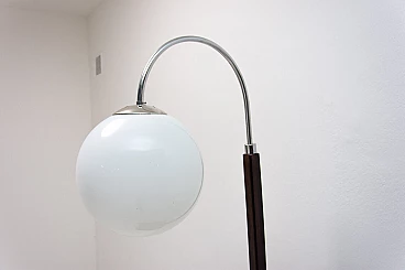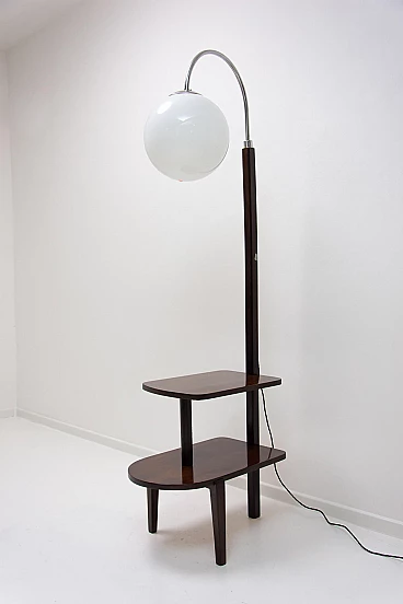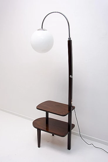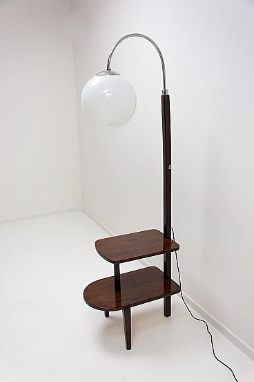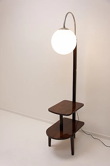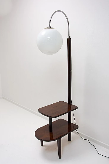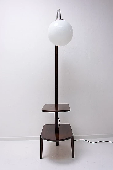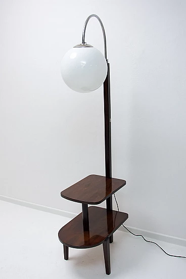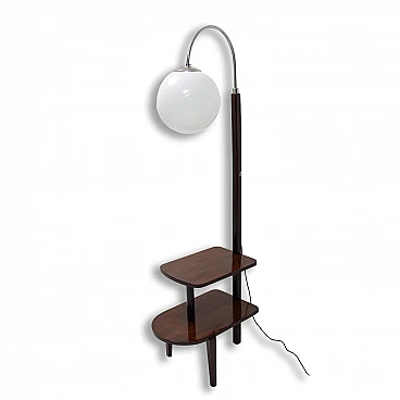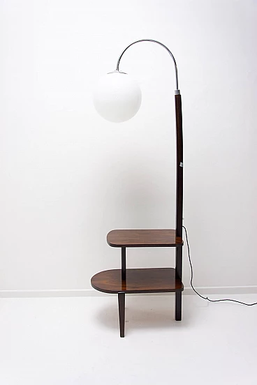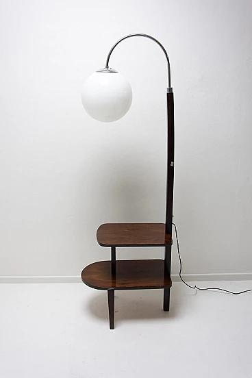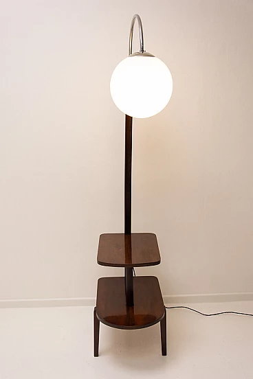 Lampada da terra Art Déco di Thonet realizzata in Boemia negli anni '20-'30. Numero di catalogo D-623. Avendo due piccoli ripiani può essere usata anche come tavolino o comodino. Struttura in metallo cromato, piani in noce e paralume in vetro. Restaurata e con cablaggio nuovo. Manca un'etichetta. Paralume: 30 cm.