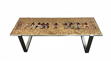 Tavolino da caffè con decorazioni egizie. Progettato da De Nisco e prodotto negli anni '70. Base in acciaio cromato, ripiano superiore dipinto a mano. Ottime condizioni, piccoli segni dovuti al passato utilizzo ed al tempo.