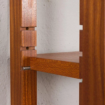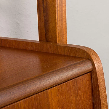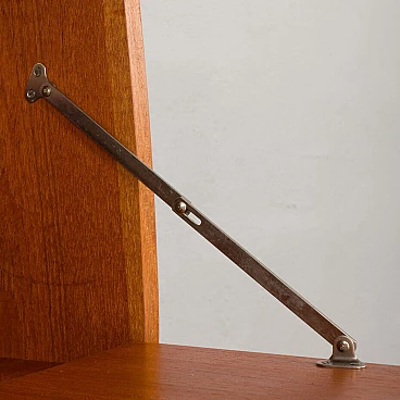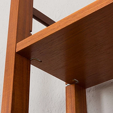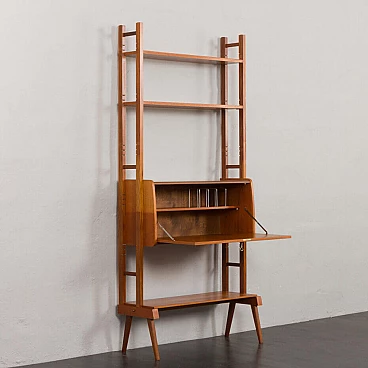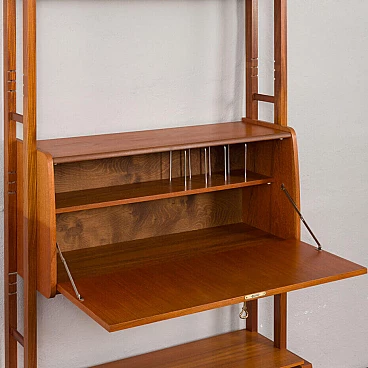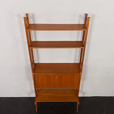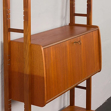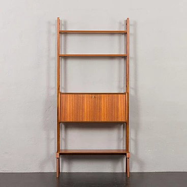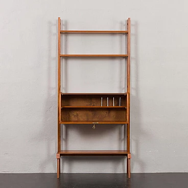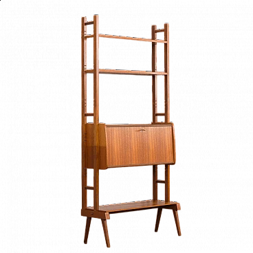 Libreria scandinava moderna di metà secolo con secretaire prodotta negli anni '60. È realizzata in legno di teak con parti impiallacciate in teak. Tre ripiani e una scrivania creano uno spazio discreto per l'ufficio di casa. Il mobile è dotato di un ripiano interno e di pratici scomparti. Si può chiudere con la chiave, che è inclusa. Si tratta di un sistema di scaffali interamente modulare, che si adatta perfettamente a piccole camere da letto o soggiorni. I supporti verticali e le gambe affusolate creano linee geometriche, sottolineando l'origine scandinava del mobile, mentre gli elementi in ottone conferiscono un aspetto imponente. L'unità a parete comprende: un secretaire-scrivania o mobile bar/ con pratici scomparti e ripiano H: 41/ L: 88/ P:33 cm; due ripiani profondi 21 cm; un ripiano profondo 33 cm; due supporti in teak, ciascuno lungo 206 cm. Si tratta di un pezzo bello e funzionale in fantastiche condizioni originali d'epoca, con lievi tracce d'uso, come una leggera decolorazione - schiarita dal sole sul lato sinistro del mobile bar/segreteria.