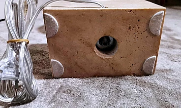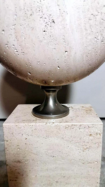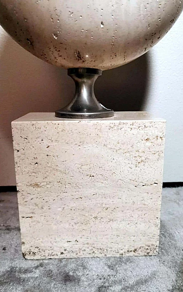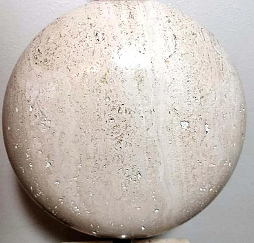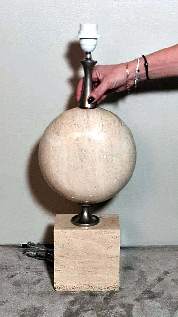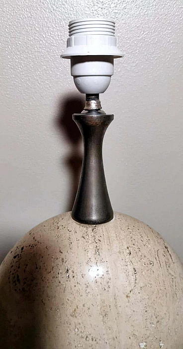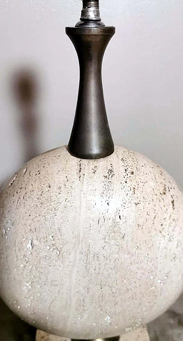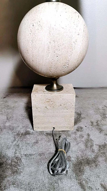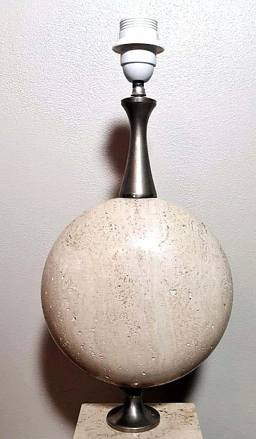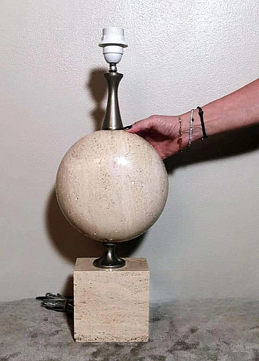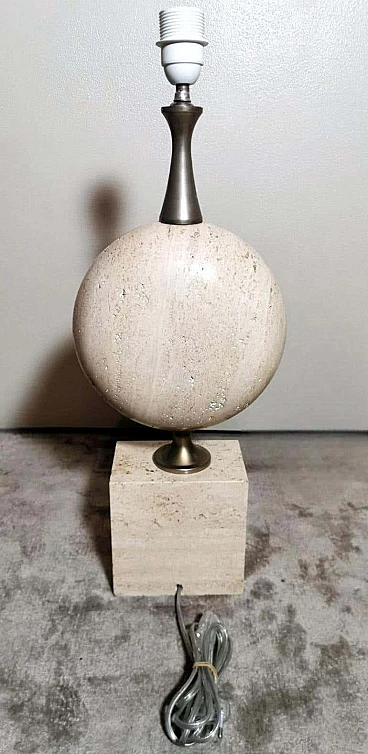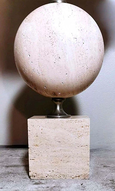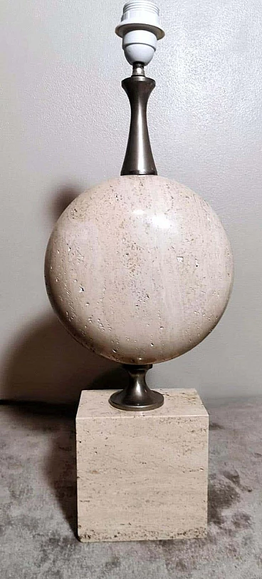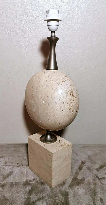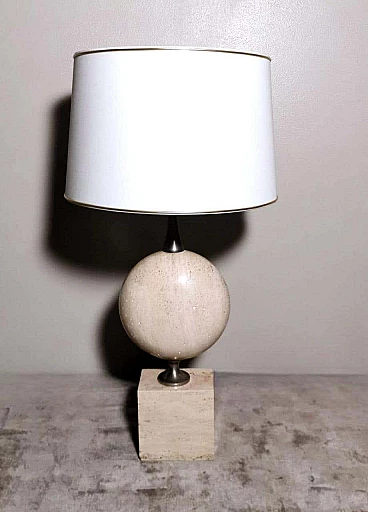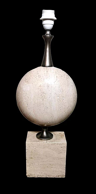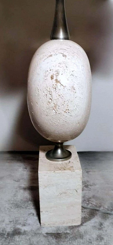 Elegantissima lampada in travertino. La base a forma di parallelepipedo sostiene, con un attacco in ottone brunito e spazzolato, una perfetta figura geometrica rotonda e lenticolare. Vi è poi una struttura tubolare svasata, sempre in ottone, alla cui sommità è posto il punto luce. L'insieme è esteticamente lineare e gradevole e, essendo più alto di una normale lampada da tavolo, ha un peso notevole. È stata realizzata in Francia dalla Maison Barbier tra il 1960 e il 1967. La Maison Barbier era una piccola fabbrica in Rue du Pré aux Clercs, vicino al Boulevard Saint-Germain, nel centro di Parigi. Philippe Barbier è stato un quotato designer francese del XX secolo, ha disegnato mobili e tavoli, ma è rimasto famoso per le sue originali lampade, che con la loro forma innovativa, insolita e senza tempo sono diventate popolari in tutto il mondo, ancora oggi sono molto amate dai collezionisti. Famosi registi cinematografici hanno utilizzato le lampade di Barbier nelle ambientazioni dei loro film. Ma oltre al design, la lampada ha un altro valore, lo straordinario e prestigioso materiale con cui è stata realizzata: il travertino. Il travertino toscano è sinonimo di fascino, eleganza, semplicità e versatilità che nobilita l'arte del costruire. Il travertino, estratto fin dall'epoca etrusca nel bacino di Rapolano, nel cuore delle Crete Senesi, parte dalla storia per fare la storia; infatti, questa pietra calcarea, nell'equilibrio tra flessibilità e rigidità, ha permesso e permette tuttora alla creatività di architetti e designer come la Maison Barbier di ideare realizzazioni di assoluto valore. La Pietra di Rapolano, come materiale da costruzione, è stata utilizzata in molti palazzi ed edifici, anche storici, del territorio senese. La Torre del Mangia in Piazza del Campo, sede del Monte dei Paschi fondato nel 1472 a Siena, ne rappresenta alcuni esempi eclatanti. Ma tutta la città di Siena è in gran parte realizzata in Pietra di Rapolano. La nostra lampada quindi nel complesso, oltre alla preziosità della pietra, ha un design moderno e contemporaneo, non troppo carico ma essenziale, un pezzo d'arredo unico, raffinato ed elegante allo stesso tempo. La foto con il paralume è solo esplicativa, la lampada viene fornita senza, in modo che ognuno possa scegliere il colore in modo personale da abbinare al proprio arredamento. La lampada è in buone condizioni Si prega di notare: l'impianto elettrico è nuovo ma il cablaggio è europeo, e la compatibilità di tensione in altri stati dovrebbe sempre essere verificata da un elettricista prima dell'uso. Misura (senza paralume) altezza cm.61, diametro cm.24, profondità base cm.15. Per tutte le nostre spedizioni utilizziamo materiali di imballaggio speciali (casse di legno su misura, polistirolo, ecc.) per la massima protezione e sicurezza degli oggetti.
