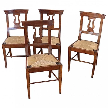 serie di quattro importanti sedie antiche realizzate in solido legno di noce massello epoca Impero primi anni dell'ottocento secolo XIX. Le sedie sono caratteriizzate da particolare schienale intagliato a mano a lira. Le sedie sono antiche restaurate pronte per essere collocate nella vostra abitazione e usate. Tutti dettagli visibili in foto si prega di guardare bene le immagini. Prezzo trattabile inviate pure le vostre proposte di acquisto. Altezza della seduta 44 cm