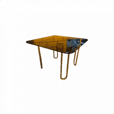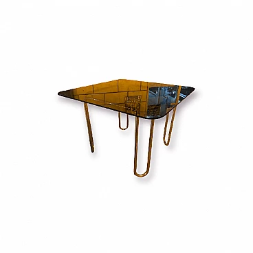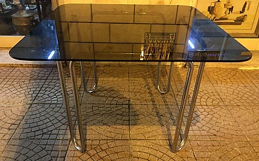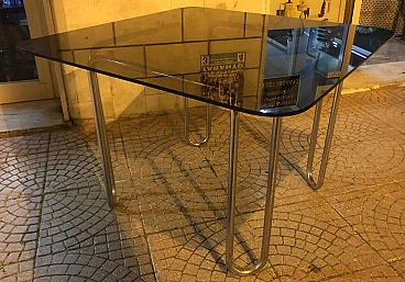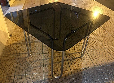 Tavolo in acciaio cromato con piano in cristallo fumè, anni '60