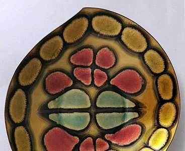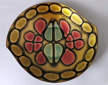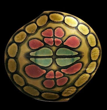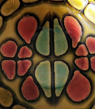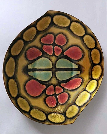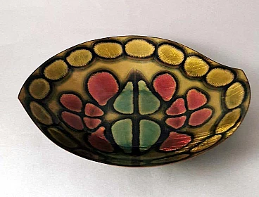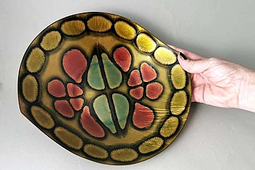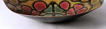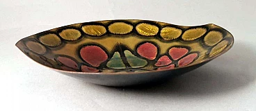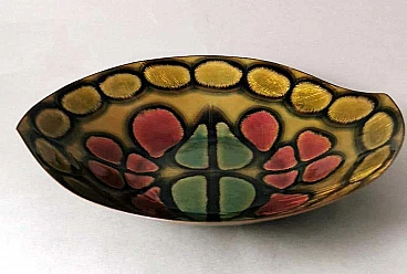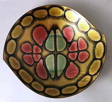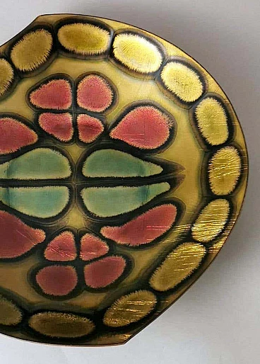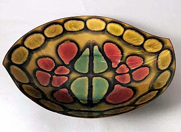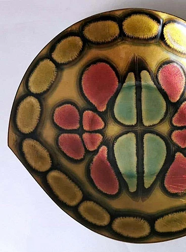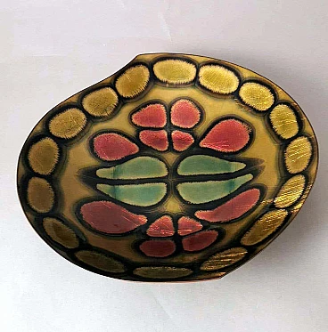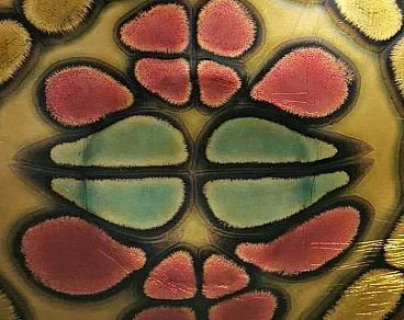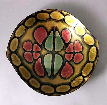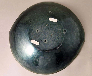 Deliziosa e particolare ciotola italiana in rame smaltato. È stata realizzata con l'antica e ormai perduta tecnica della smaltatura a fuoco vivo su metallo. Dopo aver modellato la ciotola di rame con un martello, l'artigiano smaltatore smaltava uniformemente la parte inferiore, poi con grande maestria creava il disegno all'interno. Poneva i colori desiderati sotto forma di ossidi sul disegno stesso, riscaldando il tutto "a gran fuoco", ma facendo molta attenzione alla temperatura per evitare che i colori si fondessero tutti insieme invece di rimanere separati; è solo l'abilità e la maestria dell'artigiano che rende possibile la creazione di oggetti simili. La ciotola è stata realizzata tra il 1950 e il 1955 in un laboratorio di Padova da maestri artigiani che sicuramente hanno collaborato con Paolo De Poli. Paolo De Poli (Padova, 1905-1996), artista poliedrico formatosi tra Padova e Venezia, ha ridato vita all'antica arte della lavorazione dello smalto su metallo, estendendone i tradizionali campi di applicazione (oggetti preziosi, arte sacra) a oggetti e arredi, sconfinando negli ambiti propri del design. Viaggiando negli anni Trenta si interessa alle antiche tecniche di smalto vetrificato nei musei d'arte e nei siti archeologici. Affascinato da quest'arte, dal 1933 si dedica alla creazione di smalti su metallo. Inizialmente produce piccoli e raffinati oggetti decorativi caratterizzati da forme dettagliate e colori brillanti. Ottenendo un maggiore controllo, si pone all'avanguardia dell'innovazione migliorando il processo produttivo. Negli anni Venti stabilisce il suo laboratorio a Padova, avvalendosi anche della collaborazione di piccoli laboratori della città veneta, e crea una vasta gamma di oggetti, tra cui sculture, piatti, vasi, lampade e gioielli. La tradizione veneta della lavorazione del rame smaltato è particolarmente radicata in alcune zone della regione, in particolare a Padova, dove questa lavorazione esiste fin dall'antichità. La ciotola è in buone condizioni, le linee che si vedono in alcune foto fanno parte della lavorazione e appaiono a seconda della luce che riceve la ciotola; non sono un difetto. Misura larghezza 27 cm, profondità 25 cm, altezza 5 cm. Per tutte le nostre spedizioni utilizziamo materiali di imballaggio speciali (casse di legno su misura, polistirolo, ecc.) per la massima protezione e sicurezza degli oggetti.