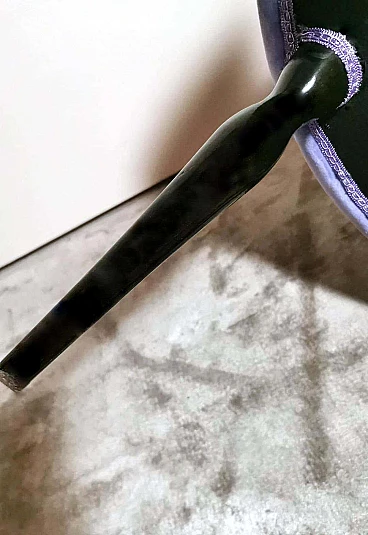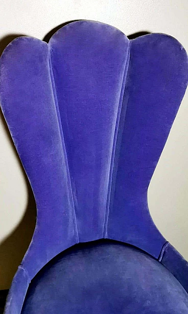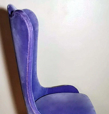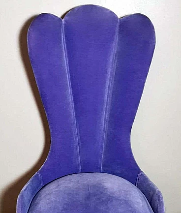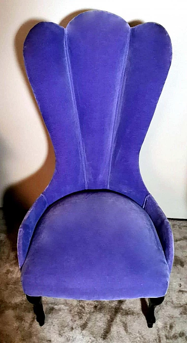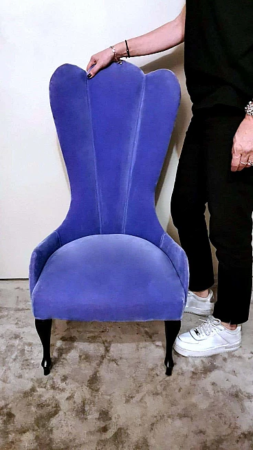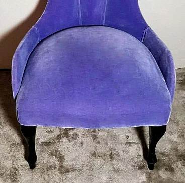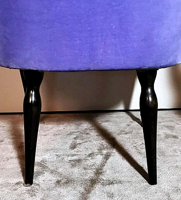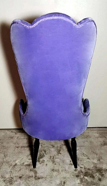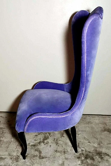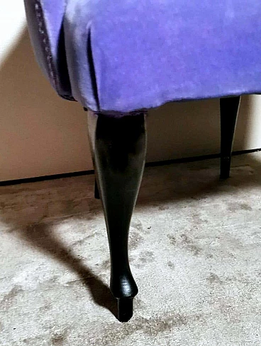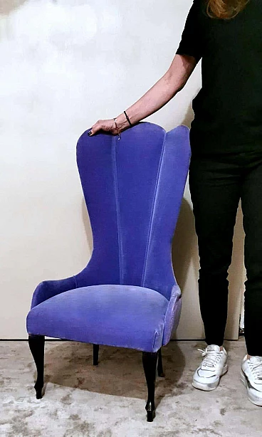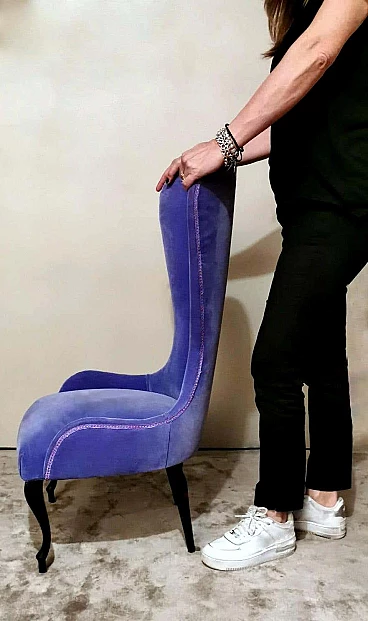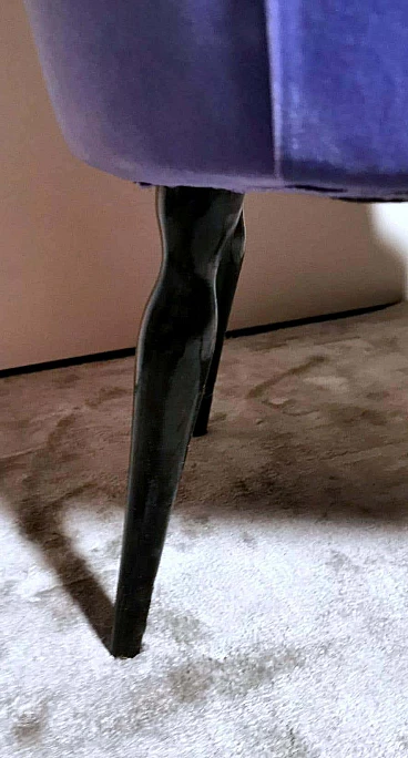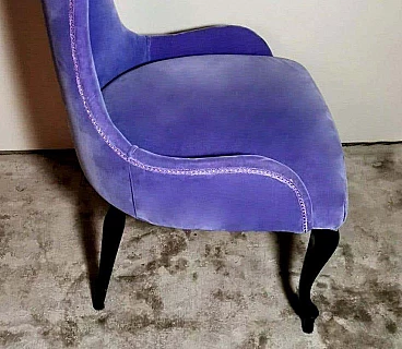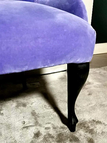 Graziosa e vezzosa poltrona da camera italiana. La forma è particolarmente gradevole, le gambe anteriori sono "cabriole", mentre quelle posteriori, molto sottili, sono cilindriche affusolate e tornite; tutte le gambe sono in legno laccato nero. Il rivestimento, in velluto viola liscio, è stato realizzato in un secondo momento; una raffinata decorazione a passamaneria è stata collocata dai braccioli lungo tutto lo schienale, e anche sotto la seduta e intorno alla parte superiore delle gambe, un dettaglio decorativo che aggiunge un tocco di eleganza e personalità alla poltrona. La nostra poltrona è stata prodotta in stile "Hollywood" tra il 1950 e il 1955 in Brianza, una regione situata a nord di Milano, in Italia, che era ed è tuttora famosa per la produzione di mobili di alta qualità, tra cui le poltrone; numerose aziende e artigiani operavano nella zona e contribuivano alla produzione di poltrone di lusso. Le poltrone degli anni Cinquanta erano spesso caratterizzate da forme curve e sinuose, con schienali arrotondati e braccioli arrotondati o leggermente inclinati. Queste curve morbide conferivano alle poltrone un aspetto accogliente e confortevole. Le poltrone degli anni Cinquanta erano spesso progettate per adattarsi agli spazi delle camere da letto dell'epoca, che tendevano a essere più piccole di quelle odierne. Di conseguenza, le poltrone degli anni Cinquanta erano spesso di dimensioni compatte e non occupavano troppo spazio. Inoltre, le poltrone degli anni '50 erano caratterizzate da uno stile retrò unico che le rendeva immediatamente riconoscibili. Erano spesso caratterizzati da una combinazione di eleganza classica e un tocco di modernità, con l'uso di colori audaci e forme avvolgenti. Lo stile hollywoodiano nell'arredamento è un'estetica ispirata all'epoca d'oro di Hollywood, dagli anni Venti agli anni Cinquanta. Questo stile è caratterizzato da elementi lussuosi, glamour e opulenti, spesso con un tocco di eccentricità. I mobili in stile hollywoodiano sono caratterizzati da linee sinuose ed eleganti. Sedie, poltrone, divani e letti presentano spesso forme arrotondate o curve accentuate. La poltrona è in buone condizioni. Misura larghezza 51 cm, profondità 50 cm, altezza 100 cm, seduta 34 cm. Per tutte le nostre spedizioni utilizziamo materiali di imballaggio speciali (casse di legno su misura, polistirolo, ecc.) per la massima protezione e sicurezza degli articoli.