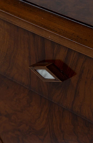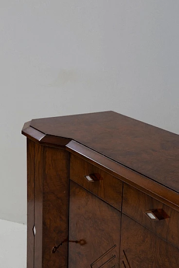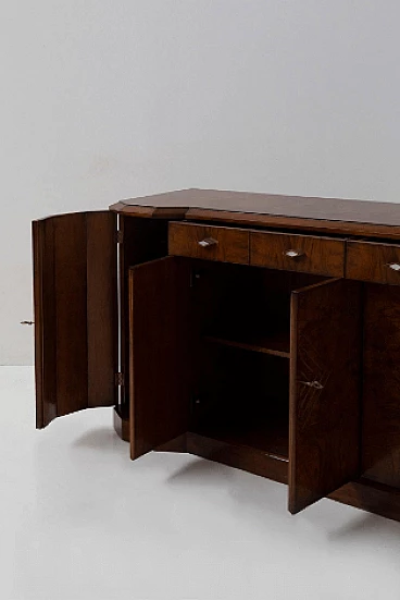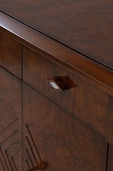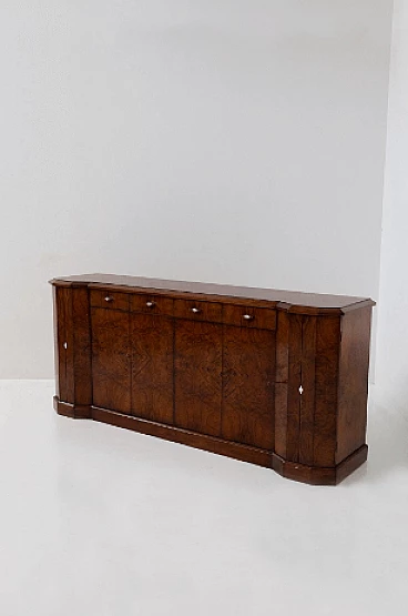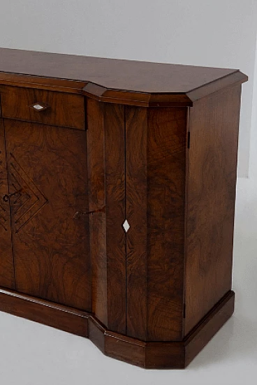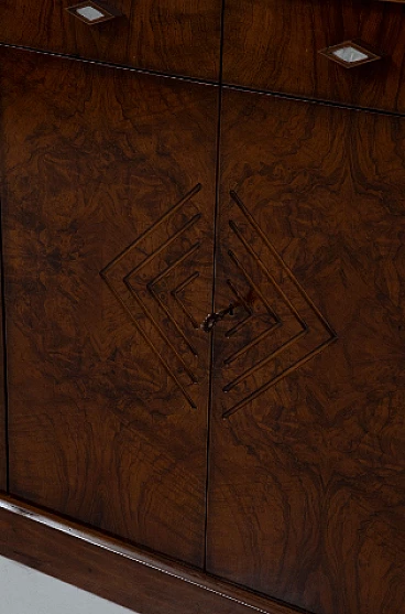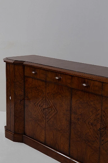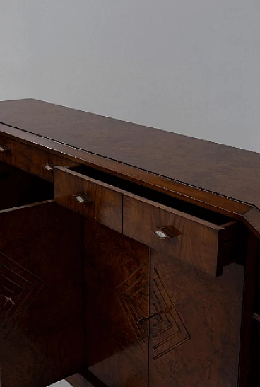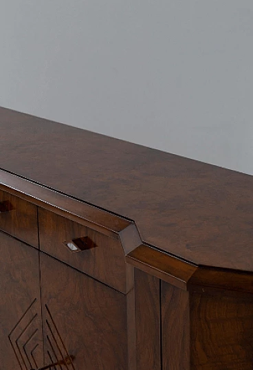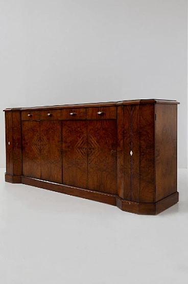 Credenza stile Art Déco in radica di noce, anni '70. Questo pezzo è una testimonianza dell'impareggiabile maestria degli artigiani italiani e mette in mostra la bellezza senza tempo dell'elegante legno, con le sue affascinanti venature messe in risalto con grazia. Ogni centimetro di questa credenza trasuda raffinatezza e maestria, con eleganti linee geometriche che rimandano all'epoca d'oro dell'Art Déco. Il suo design rende omaggio all'opulenza e all'eccellenza di quel periodo straordinario, rendendolo un vero tesoro per i collezionisti e gli intenditori. Le ante sono intricatamente decorate, vantano intarsi ipnotici che aggiungono un tocco di fascino etereo. All'interno delle sei ante si trovano scomparti accuratamente lavorati e che offrono ampio spazio per riporre oggetti vari. Stile e funzionalità coesistono in perfetta armonia all'interno di questo mobile. I quattro cassetti, impreziositi da elegantissimi pomelli a forma di rombo, invitano a esplorare il loro fluido movimento di scorrimento; aprendoli viene rivelato un interno ben organizzato, che offre sia praticità che eleganza. Non presenta danni o rotture, solo leggerissimi graffi in alcune parti.