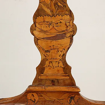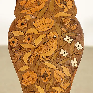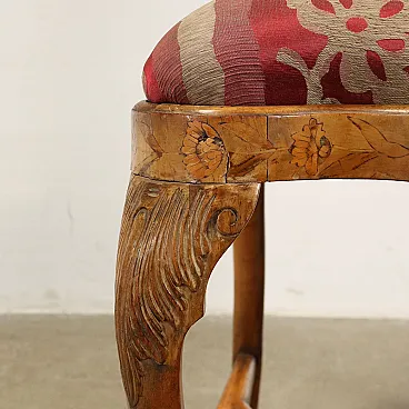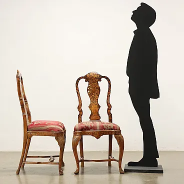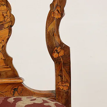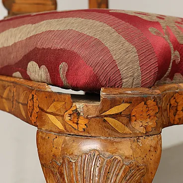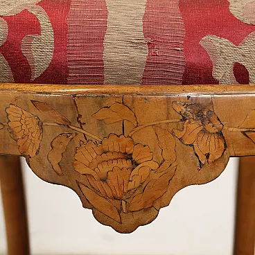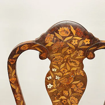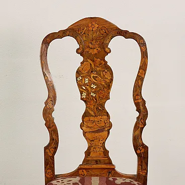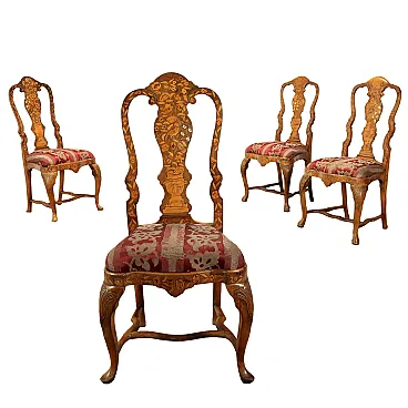 Gruppo composto da due coppie diverse di sedie di gusto barocchetto, Olanda terzo quarto XIX secolo. Realizzate in legno di quercia impiallacciato in radica di noce, presentano intarsi in acero e altri legni con piccole parti in avorio, quest'ultimo utilizzato sia per la resa degli occhi degli uccelli che nei petali di alcuni fiori. Gli intarsi sono di gusto floreale con dei vasi sulle cartelle a giorno dello schienale. Gambe e schienale mossi, piedi di una coppia intagliati a claw and ball, cuscini della seduta amovibili. Presente documento CITES.