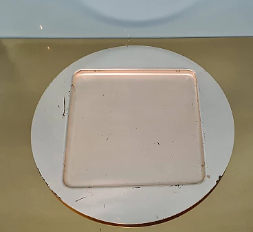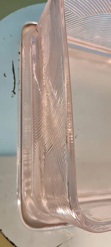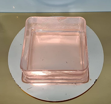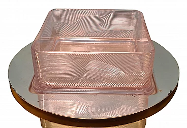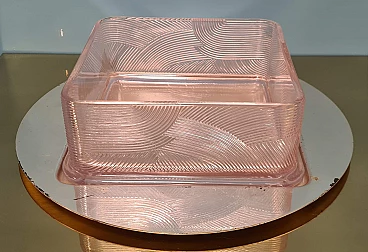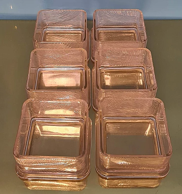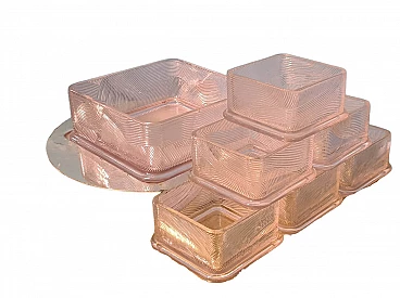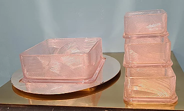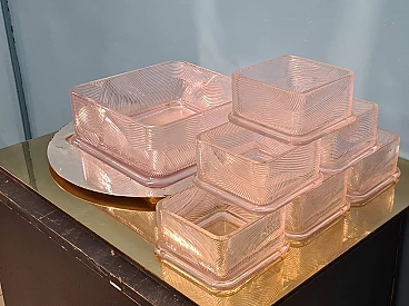 Servizio da macedonia di Sergio Asti per Arnolfo di Cambio, anni '70. Esempio dell'inconfondibile design dell'architetto milanese Sergio Asti e dell'alta qualità dei cristalli della vetreria Toscana famosa in tutto il mondo. Realizzato con cura e attenzione ai dettagli, questo set è perfetto per chi ama presentare la frutta in modo elegante e raffinato. Il servizio da macedonia comprende una ciotola quadrata in cristallo rosa con decorazioni in rilievo e una base tonda in acciaio, una serie di sei ciotole più piccole, sempre in cristallo rosa, per servire la frutta. Una delle ciotoline è leggermente sbeccata e c'è qualche segno di usura sulla base in acciaio. La base in acciaio ha un diametro di 33 cm. La ciotola è alta 8 cm e ha un diametro di 22 cm. Le ciotoline sono alte 6 e hanno un diametro di 11 cm.