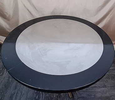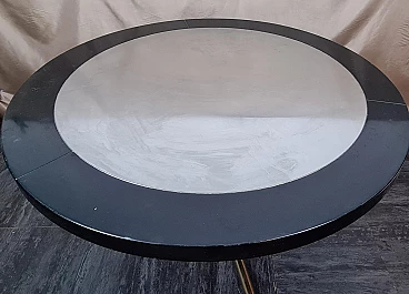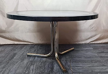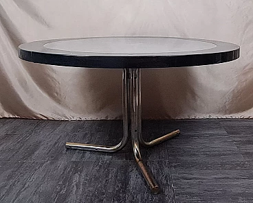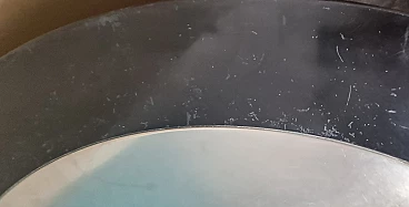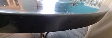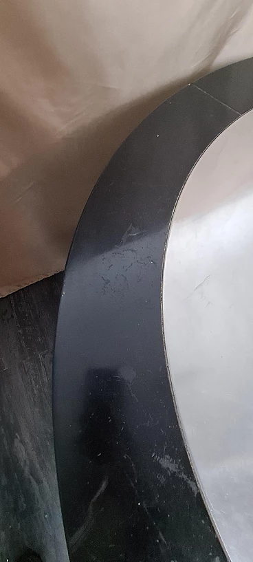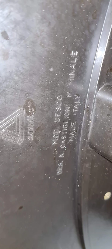 Il tavolo è in condizioni discrete, presenta segni di usura e patina sulla parte plastica in cui vi sono anche due rotture nel bordo; la parte centrale in acciaio presenta un piccolo bollo e dei graffi.