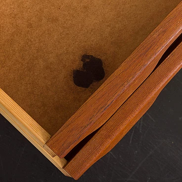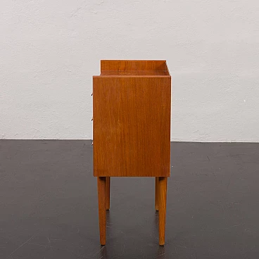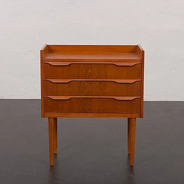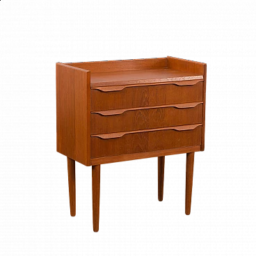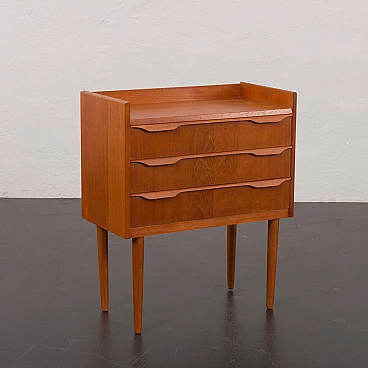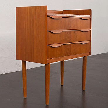 Piccola cassettiera danese vintage in teak con tre cassetti e maniglie scultoree in teak massiccio, realizzata da un produttore danese negli anni Sessanta. Molto probabilmente è stata progettata come cassettiera da ingresso, ma potrebbe essere utilizzata anche come tavolino o comodino. I bordi leggermente sporgenti aggiungono versatilità al pezzo, rendendolo perfetto per un corridoio o una cabina armadio abbinato a uno specchio danese del Medioevo. Le ricche venature dell'impiallacciatura di teak, la selezione diligente del frontale e i dettagli in teak massiccio dimostrano la maestria dell'artigianato danese del Mid Century. Le gambe affusolate in teak massiccio sottolineano l'origine scandinava e sono smontabili, per un trasporto più comodo. Il comò è stato controllato dal nostro team. Ci siamo assicurati che i cassetti siano puliti e funzionino correttamente. In molte occasioni, dobbiamo levigare le parti più utilizzate (se sono molto graffiate). Qui abbiamo ringiovanito il legno con strati di olio danese. Lasciamo piccoli segni d'uso che non rovinano l'estetica e confermano solo l'originalità. Cerchiamo di riportarlo al suo aspetto migliore, sempre considerando che ha 60 anni. Nel complesso, in ottime condizioni vintage, con cassetti puliti e perfettamente funzionanti.