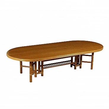 Tavolo di grandi dimensioni; legno impiallacciato rovere, bambù, strisce in cuoio. Prodotto in buone condizioni, presenta piccoli segni di usura.