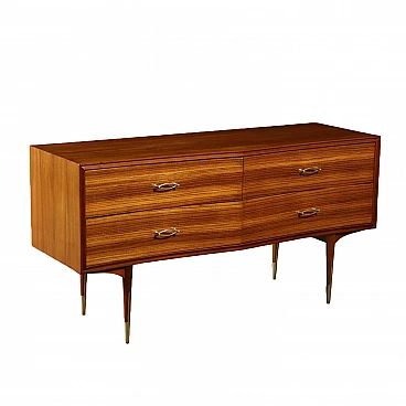 Comò con cassetti frontali; dalla linea concava, legno impiallacciato, maniglie e puntali in ottone. Prodotto in condizioni molto buone che può mostrare lievi tracce di usura; può aver subito interventi di restauro effettuati da un esperto.