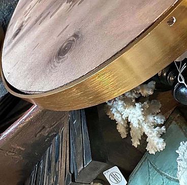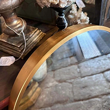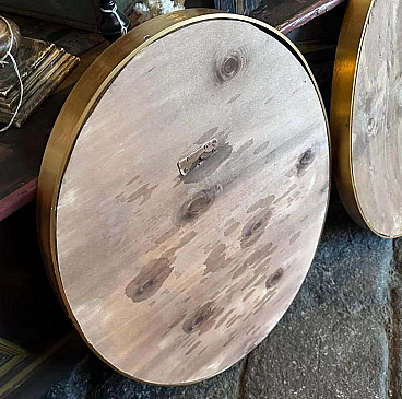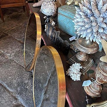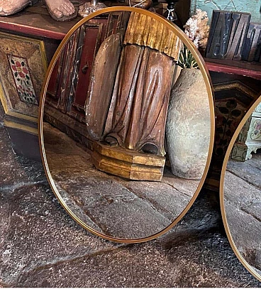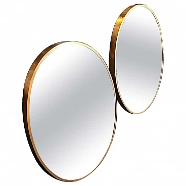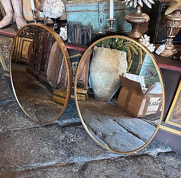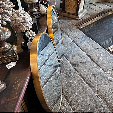 Coppia di specchi da parete ovali in alluminio dorato della metà del secolo scorso, realizzati a mano in Italia negli anni Ottanta nello stile di Gio Ponti. Questo set di specchi da parete ovali è un pezzo straordinario ed elegante che cattura l'essenza del design di metà secolo. Ispirato al famoso architetto e designer italiano Gio Ponti, questo specchio riflette l'estetica elegante e sofisticata che ha definito l'epoca. Lo specchio è realizzato in alluminio dorato, un materiale comunemente utilizzato a metà del secolo scorso per la sua durata e l'aspetto lussuoso, che conferisce una luce calda e invitante, aggiungendo un tocco di opulenza a qualsiasi spazio. La cornice degli specchi è meticolosamente ovale e sagomata, con linee fluide e forme caratteristiche dello stile di Gio Ponti. Il design degli specchi è sia funzionale che artistico. L'ampia superficie riflettente offre un ampio spazio per la visione personale, mentre la cornice funge da elemento decorativo che migliora l'impatto visivo complessivo. La superficie liscia ed elegante dell'alluminio dorato crea un contrasto accattivante con il vetro specchiato, amplificando le proprietà riflettenti dello specchio. La combinazione di materiali produce un armonioso gioco di luci e ombre, migliorando ulteriormente l'estetica del pezzo. Questo set di specchi da parete non è solo un oggetto funzionale ma anche un'opera d'arte che incarna l'eleganza e la raffinatezza del design di metà secolo. Emana un fascino senza tempo che si integra perfettamente con vari stili di interni, da quelli contemporanei a quelli di ispirazione retrò. Appeso in salotto, in camera da letto o in corridoio, questo specchio diventa un punto focale che eleva l'ambiente e aggiunge un tocco di fascino vintage.