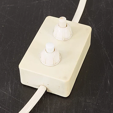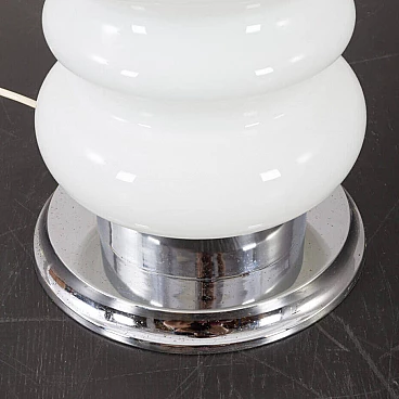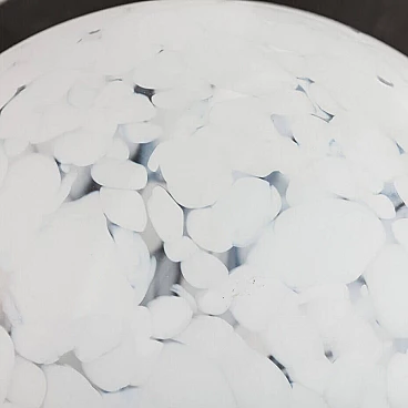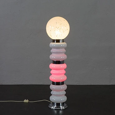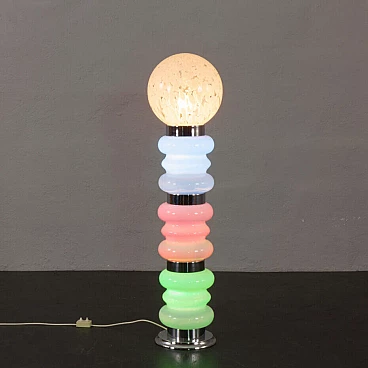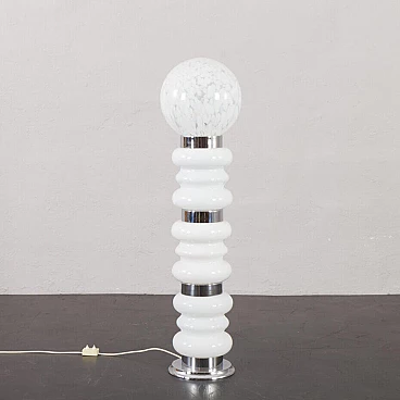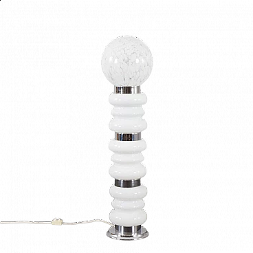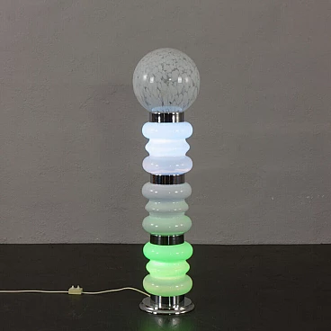 Una grande lampada da terra in stile Space Age disegnata da Carlo Nason per Mazzega negli anni Settanta. È realizzata in vetro di Murano soffiato a mano bianco e screziato. La base in acciaio e il globo superiore in vetro screziato, uniti da tre elementi futuristici composti da tre anelli ciascuno, esaltano il design Space Age, che si basa sull'idea del mondo dopo il successo dell'energia atomica e dei viaggi nello spazio. Tutte le sezioni sono unite da acciaio cromato e dotate di illuminazione multicolore (lampadine colorate) che permette di illuminare in vari colori. Il doppio interruttore a pedale permette di accendere facilmente la lampada in varie combinazioni illuminando singoli elementi o l'intero pezzo. Il design di Carlo Nason è uno dei più riconoscibili in termini di stile moderno italiano di metà secolo dell'illuminazione in vetro soffiato di Murano, ed è strettamente associato a Mazzega. Il nostro team ha ispezionato e verificato meticolosamente l'impeccabile funzionalità della lampada. La lampada è in eccellenti condizioni originali d'epoca. La spina e l'interruttore sono originali e perfettamente funzionanti. L'interruttore ha due pulsanti: uno accende la seconda sezione dal basso e l'altro, in alto, accende le altre due; è possibile farle funzionare separatamente o insieme. Colore ottenuto da lampadine colorate. Quattro lampadine incluse: verde, rossa, blu e bianca. La lampada richiede lampadine di tipo E27. Cavo lungo 280 cm.
