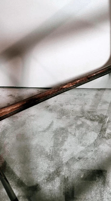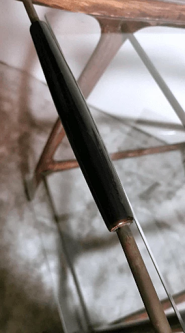 Particolare e iconico carrello da servizio o da tè. Le linee morbidamente proporzionate della struttura sono realizzate in legno di noce trattato con una leggera vernice protettiva per conferirgli una lucentezza discreta ed elegante, caratteristica dei carrelli di Cesare Lacca. Due lastre rettangolari di vetro, una superiore e l'altra inferiore, fungono da piano d'appoggio e aggiungono un tocco di raffinatezza e lusso al design complessivo. Per una maggiore praticità e sicurezza, le due lastre di vetro sono inserite in scanalature ricavate nel telaio in legno; grazie a questo design, il carrello offre ampio spazio per riporre ed esporre bottiglie, bicchieri e altri accessori da bar. Due barre di ottone con un riporto di legno al centro sono posizionate alle estremità superiori del carrello e fungono da impugnature per spostarlo. Le gambe sono dotate di ruote classiche che girano a 360 gradi. Possiamo dire con certezza che il carrello è una delle tante ma inconfondibili creazioni del designer Cesare Lacca. È stato realizzato tra il 1950 e il 1955 presso una delle tante falegnamerie artigianali della Brianza (Lombardia, Italia), una località storica nota per i suoi mobili di design, realizzati con grande maestria artigianale e dove Lacca faceva realizzare la maggior parte dei suoi carrelli (per i mobili si avvaleva di artigiani di alto livello nella zona di Cantù, in Lombardia). Nato a Napoli nel 1929, l'architetto-scenografo-designer italiano Cesare Lacca, ha creato mobili modernisti e opere in metallo negli anni '50. Come molti, Lacca si trasferì a Milano dopo la Seconda Guerra Mondiale per lanciare la sua carriera. I dettagli sulla sua vita personale e sulla sua formazione professionale sono molto scarni, ma le sue opere hanno lasciato il segno sia in Italia che all'estero. Lacca è particolarmente noto per i suoi mobili in stile moderno degli anni '50, che combinavano forme geometriche pulite ed essenziali; i suoi pezzi erano spesso caratterizzati da dettagli curvi e finiture laccate o dipinte che conferivano alle sue creazioni un aspetto distintivo. Le opere più iconiche di Lacca sono senza dubbio i suoi carrelli bar in legno; sono considerati pezzi funzionali e decorativi molto ricercati dai collezionisti e dagli appassionati di design moderno di metà secolo. Nel corso della sua carriera, Lacca ha disegnato un gran numero di carrelli da tè e da portata (che corrispondono alla maggior parte dei suoi pezzi disponibili sul mercato odierno), tavolini da caffè e portariviste e, sebbene esistano molte versioni diverse dei carrelli, tutti hanno le stesse caratteristiche organiche e linee morbide. Partecipò a mostre nazionali e internazionali, tra cui le Triennali di Milano del 1951 e del 1954 e, nel 1950/1953, "Italy at Work", un'importante mostra itinerante che promuoveva il design italiano negli Stati Uniti. Roger dice di lui: "La varietà e la qualità delle sue creazioni lo collocano tra gli architetti e i designer più influenti dell'attuale movimento modernista; la qualità del suo lavoro risplende attraverso l'effetto decorativo, senza cedere all'esagerazione o allo sforzo". Per quanto riguarda la struttura in legno, non abbiamo pensato di effettuare alcun restauro perché la sua patina velata in superficie e le piccole imperfezioni la rendono davvero affascinante e ne attestano l'antichità e l'autenticità. Inoltre, il restauro avrebbe snaturato la vernice originale della carrozza, che è una delle caratteristiche fondamentali delle opere di Lacca. Il carrello dovrà necessariamente essere spedito smontato, per evitare la rottura del vetro; assicuriamo che il rimontaggio è molto semplice. Per tutte le nostre spedizioni utilizziamo materiali di imballaggio speciali (casse di legno su misura, polistirolo, etc.) per garantire la massima protezione e sicurezza degli oggetti.