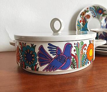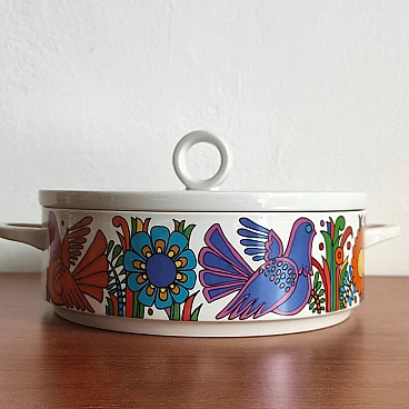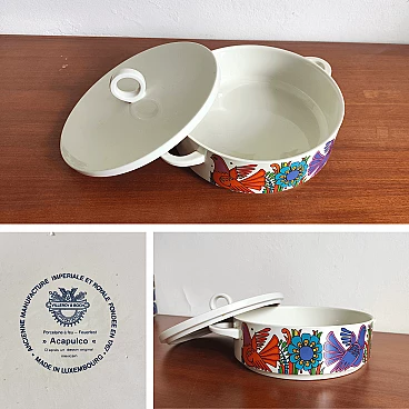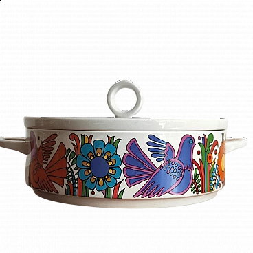 Zuppiera con coperchio in ceramica stampata, serie Acapulco di Villeroy & Boch. Produzione anni ’70, prima edizione come attesta il marchio di fabbrica colore blu. Si noti che la ristampa, fuori produzione dal 1994, ha il marchio di fabbrica di colore rosso.