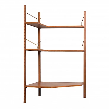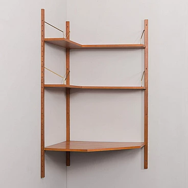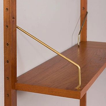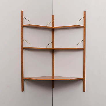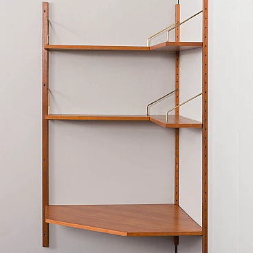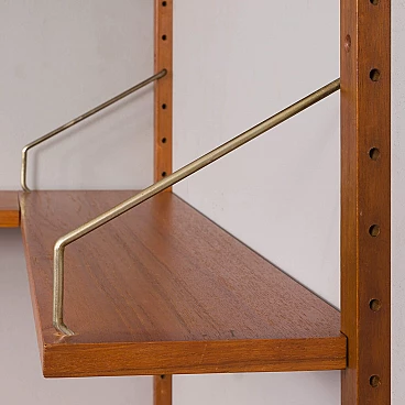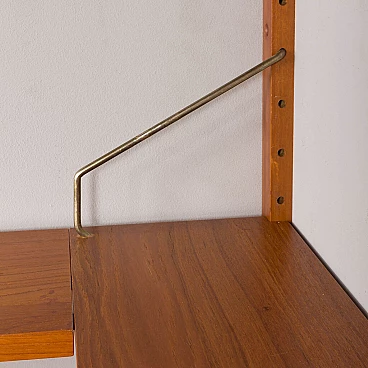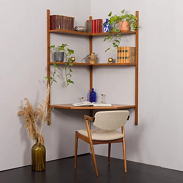 Libreria pensile angolare con scrivania di Poul Cadovius per Cado, realizzata in Danimarca negli anni '60 (validato dalla scritta incisa "Made in Denmark"). I ripiani e la scrivania sono rifiniti con impiallacciatura di teak e assemblati su binari in legno massello con ferramenta in ottone. Linee rette, legno dalle belle venature, lavorazione di qualità e un sistema di sospensione modulare esaltano lo stile caratteristico del design scandinavo. È dotata di quattro mensole unite in un'unica linea e di una scrivania ad angolo, che consente di creare un luogo perfetto per il lavoro/studio in casa. Questo mobile è interamente modulare e si può facilmente regolare l'altezza delle mensole secondo necessità utilizzando le fessure distanziate a intervalli regolari nei binari. Le quattro mensole sono profonde 20 cm (si uniscono). La scrivania è profonda 80 cm. I tre binari sono lunghi 146 cm. Il mobile è stato controllato dal nostro team: tutti i componenti si adattano insieme; il legno è stato pulito e rifinito con strati di olio danese. Condizioni fantastiche con lievi tracce d'uso.