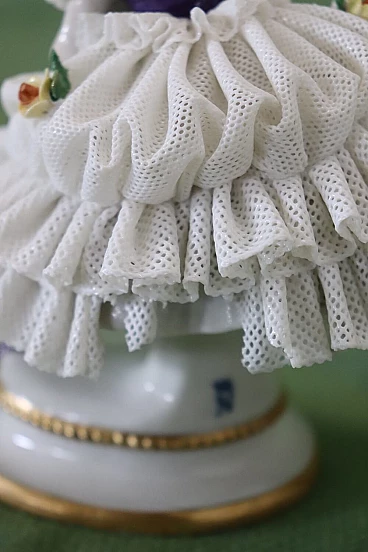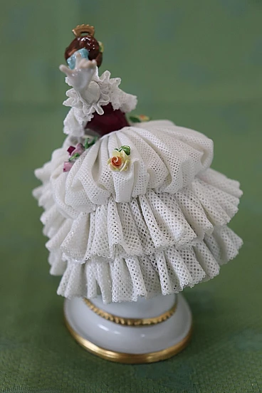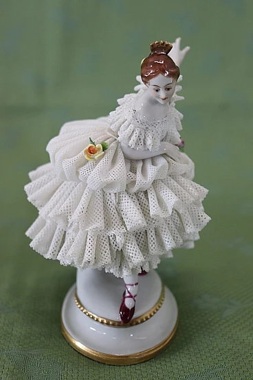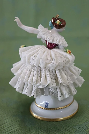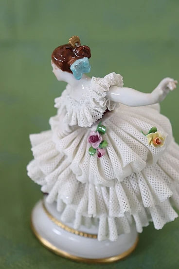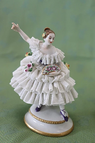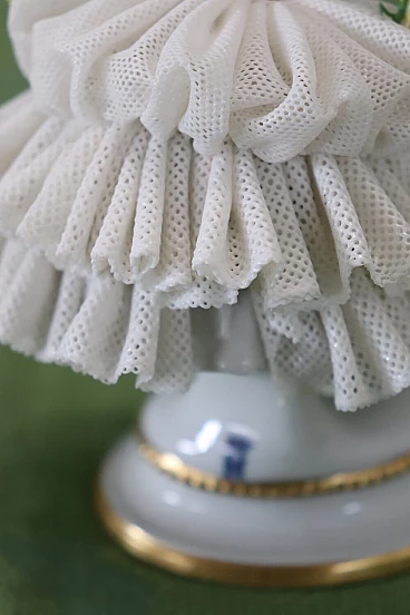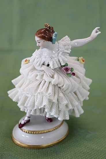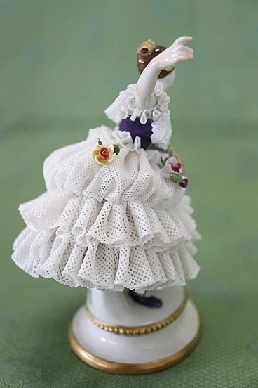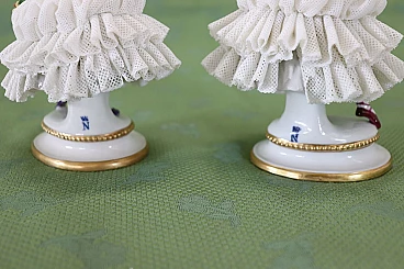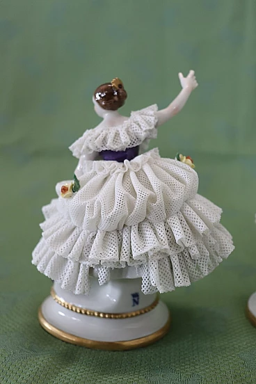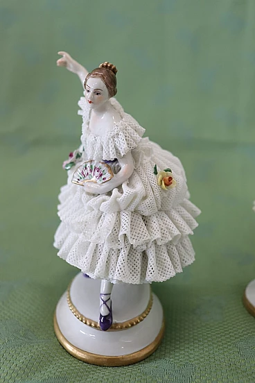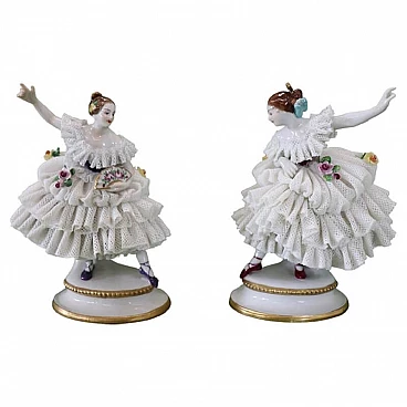 Bella coppia di statuine in raffinata porcellana di Capodimonte raffiguranti due giovani ragazze che danzano. Caratterizzate da eleganti abiti settecenteschi con ampie gonne in pizzo completamente realizzate in porcellana. Da notare la grande abilità nel realizzare l'abito nei dettagli, che sembra mosso dai passi di danza. Fantastiche le roselline applicate al vestito. Da un'importante collezione di porcellane antiche. Alcune mancanze nell'abito. Vi consigliamo di guardare bene in dettaglio tutte le foto allegate. Proposto ad un ottimo prezzo trattabile, vi invitiamo ad inviarci le vostre proposte di acquisto, le valuteremo con piacere. Altezza 14 cm, larghezza 10 cm, profondità 7 cm. Imballo professionale, spedizioni assicurate con corrieri, consegna su appuntamento solo su piano strada, no facchinaggio ai piani.