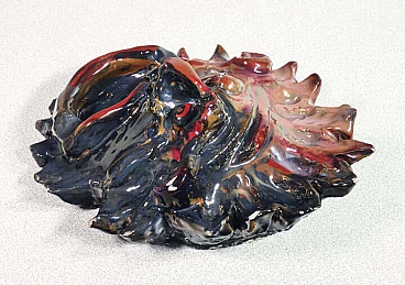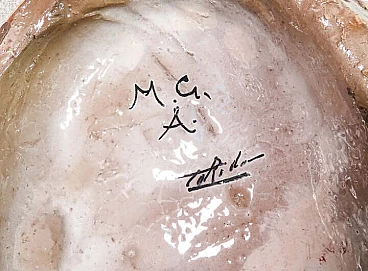 Maschera con funzione di posacenere in ceramica smaltata di Torido Mazzotti per M.G.A. (Albisola), prima metà del '900. Riporta alcune piccole mancanze nello smalto visibili in foto. Torido Mazzotti, figlio di Giuseppe Mazzotti, nasce a Savona il 31 luglio 1895. Collabora, insieme al fratello minore Tullio, alla gestione della fabbrica del padre. Studia all'Istituto di Arti e Mestieri di Savona diplomandosi nel 1914 e contemporaneamente impara a dipingere sotto la guida di Dario Ravano. Negli anni della prima guerra mondiale trova lavoro come disegnatore presso le officine Ansaldo e torna alla ceramica solo a guerra terminata, lavorando presso la manifattura M.G.A. di proprietà della famiglia e contemporaneamente frequenta, insieme al fratello Tullio, i corsi di perfezionamento tenuti da Gaetano Ballardini a Faenza. Nel 1923 si sposa con Rosa Bovio e, grazie al suo aiuto economico, apre una fabbrica ad Albisola Superiore nei locali di proprietà dei marchesi Gavotti denominata Mazzotti & C. Tra gli anni '20 e '30 è uno dei promotori della ceramica futurista albisolese. Nel 1925 presenta alcune sue ceramiche all'Esposizione Internazionale delle Arti Decorative e Moderne di Parigi. Nel 1932 i Mazzotti decidono di aprire una nuova fabbrica e Torido si occupa della progettazione dei forni elettrici fino ad allora mai utilizzati ad Albisola. Allo scoppio della seconda guerra mondiale la fabbrica deve chiudere e nel 1944, pochi mesi dopo la morte del padre Giuseppe, Torido e il fratello Tullio sono perseguitati dai nazi-fascisti. Alla fine della guerra riprendono l'attività e in poco tempo, grazie alla loro fama, ricominciano ad ospitare nella fabbrica i maggiori artisti contemporanei. Nel 1959 Torido Mazzotti si divide dal fratello Tullio e diviene, insieme ai figli Bepi e Celina, l'unico proprietario della fabbrica di famiglia alla quale da il nome Fabbrica Casa Museo G. Mazzotti 1903. Dagli anni '70, pur continuando a frequentare la manifattura e il mondo artistico albisolese, Torido Mazzotti lascia la direzione della fabbrica al figlio Bepi. Muore a Savona nel 1988. Alcuni suoi lavori sono oggi conservati nel Museo Mazzotti di Albisola. Apprendista ceramista dall'età di dodici anni presso la fornace dei Fornari ad Albisola, dopo varie esperienze come torniante dipendente a Livorno, presso la manifattura Bonfiglio e a Napoli presso i Picone, Giuseppe Mazzotti, detto Bausin, nel 1903, nei locali di Vicolo del Pozzo ad Albisola, apre una bottega dove realizza comignoli per l'edilizia. Presto la fornace diviene Fabbrica di Ceramiche d'Arte Tradizionali e Moderne Giuseppe Mazzotti e inizia la lavorazione della ceramica artistica in proprio firmando con le sue iniziali M.G.A. i pezzi che escono dalla bottega.