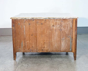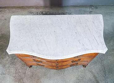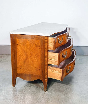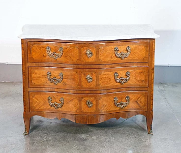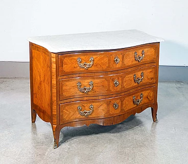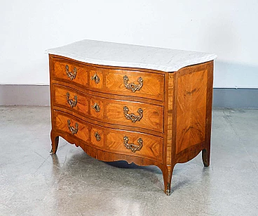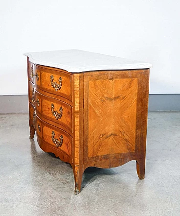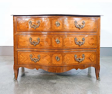 Comò Luigi XV con fronte e fianchi mossi in legno lastronato in radica, prima metà '700