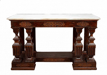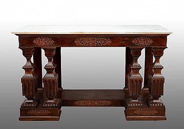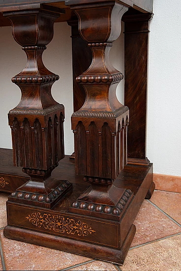 Consolle Smith napoletana in piuma di mogano con innesti di intarsio in acero. Il piano in marmo è adagiato su una fascia sottopiano intarsiata con motivi a racemi e grifoni ed è sorretta a sua volta da quattro piedi a balaustra avente una forma neogotica tipici del periodo di appartenenza. In corrispondenza delle quattro colonne vi sono dei piedi a cuscinetto sovrastati dallo stesso intarsio riportato nella fascia sottopiano. George Smith: proprietario di un grande laboratorio di ebanisteria a Londra e attivo tra il 1804 e il 1828, famoso per aver pubblicato nel 1808 un album di incisioni dal titolo “A Collection of Designs for Household Furniture”, alcuni studiosi avanzano l'ipotesi che i mobili “Smith” Napoletani fossero ispirati ai disegni di George Smith. In buono stato. Provenienza Napoli inizio XIX secolo. Misure: 160x54 cm, H 100cm. Certificato di Autenticità. Siamo a vostra disposizione per ulteriori chiarimenti o particolari fotografici. Spedizione in tutta Italia, Europa e resto del mondo a prezzi molto contenuti in massima sicurezza e tracciabile. La spedizione sarà concordata privatamente e non sarà di costo elevato.