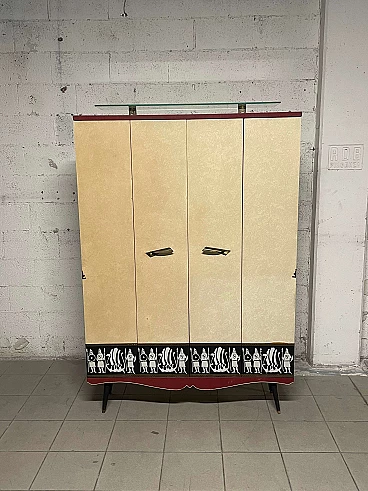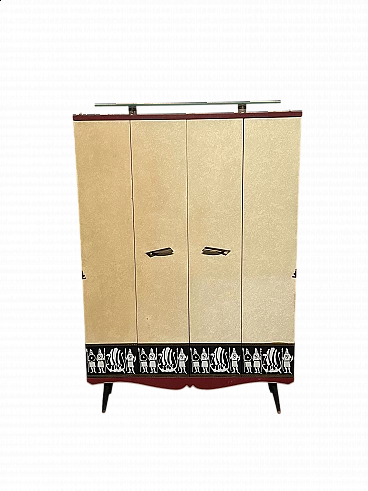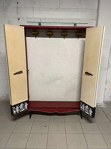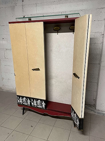 Piccolo e raffinato guardaroba da ingresso anni '50 di produzione italiana. Struttura in legno rivestito in skai bicolore, piedi conici, maniglie profili e particolari in ottone. Apertura ante a libro con meccanismo perfettamente funzionante nascosto sotto il pianetto di base.