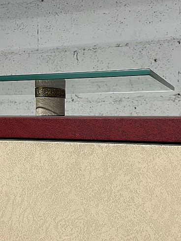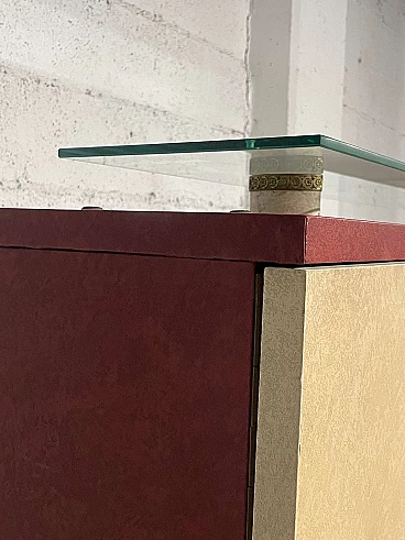 Nella parte interna sono presenti quattro appendini in ottone e sulle due pareti laterali portaombrelli sempre in ottone. Nella parte alta del guardaroba è posta la cappelliera con mensola in vetro spesso poggiante su 2 sostegni ovali sempre rivestiti in sky e profilati in ottone.