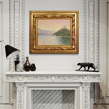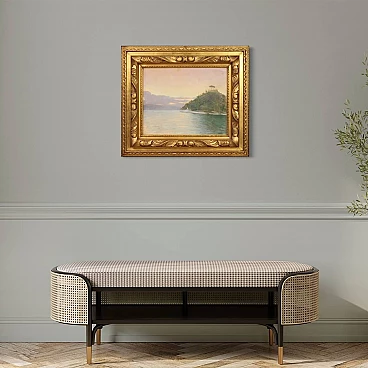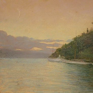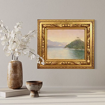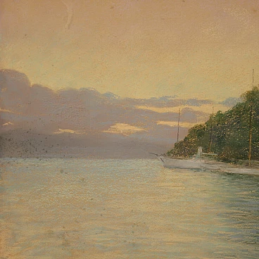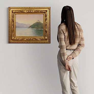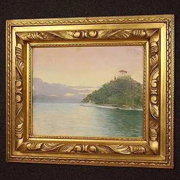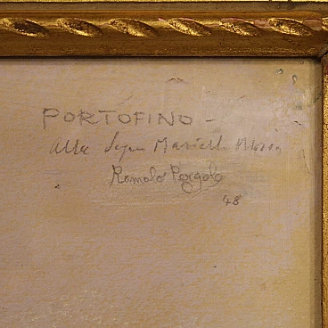 Dipinto italiano datato 1948. Pastello su carta raffigurante veduta di Portofino adornato da elegante cornice lignea dorata, di ottima qualità. Quadro di bella misura e proporzione firmato con dedica e data in alto a destra (vedi foto) riferibile al pittore Romolo Pergola (1890-1960) mancante di autentica. Dipinto di piacevole arredamento, facilmente inseribile in diversi punti della casa, ideale per un salotto o studio. Pastello caratterizzato da buona luminosità e grande delicatezza, per antiquari e collezionisti di pittura italiana del XX secolo. Cornice completa di vetro protettivo (vedi foto) carta con qualche piccolo segno del tempo, fissata sul retro con apposito cartoncino (vedi foto). Dipinto nel complesso in buone condizioni. Luce dipinto H 38,5 x L 48,5 cm.