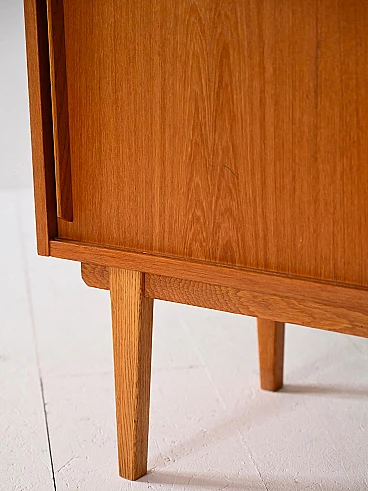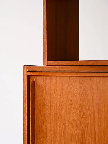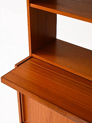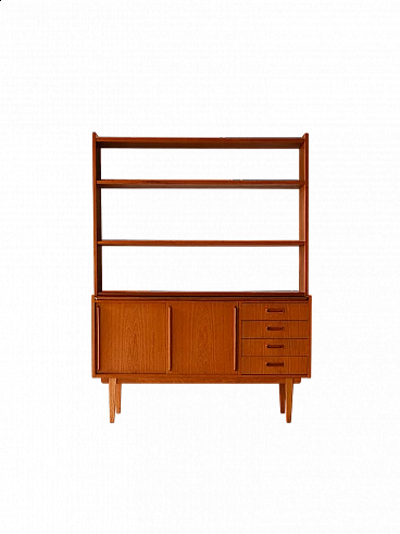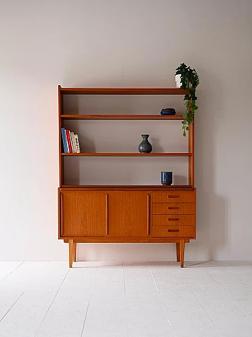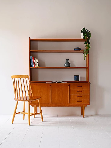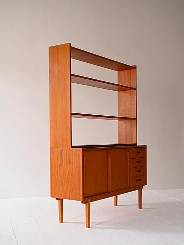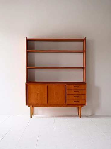 Libreria svedese in legno con ante, cassetti e scrittoio estraibile, anni '60. Mobile semplice e funzionale composto nella parte inferiore da una credenza con ante e quattro cassetti su cui poggia la parte superiore a mensole. Le linee essenziali sono arricchite da alcuni particolari come l'impugnatura in legno delle ante e quella in legno scolpito dei cassetti. Grazie al piano estraibile si trasforma in un comodo scrittoio ed è perfetta da inserire in sala o in camera come postazione per lo smart working e/o lo studio. È stato fatto un restauro conservativo. Potrebbe presentare segni del tempo.