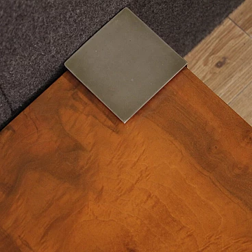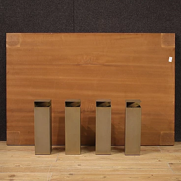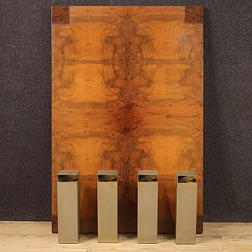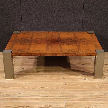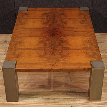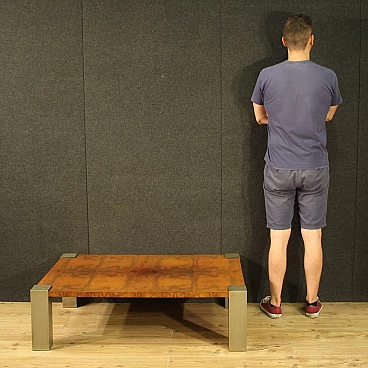 Tavolino con piano ligneo impiallacciato in noce con gambe in metallo cromato, anni '70