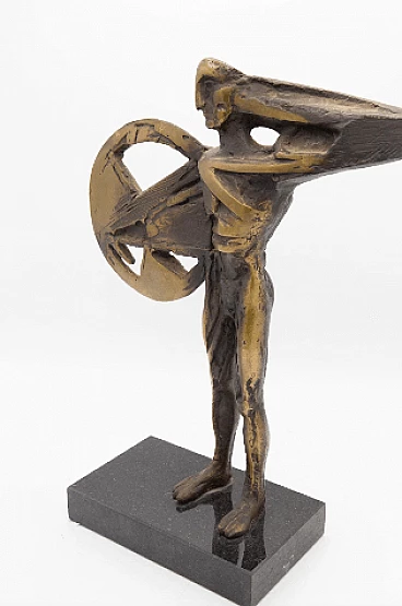 Questa scultura in bronzo è un affascinante esempio di arte Futurista italiana degli anni '30. Il movimento Futurista, sorto in Italia all'inizio del XX secolo, è stato caratterizzato da una fervente enfasi sul dinamismo, la velocità, il movimento e l'energia. Gli artisti Futuristi cercarono di rappresentare la modernità dell'era industriale attraverso l'arte, abbracciando l'idea di un futuro in costante cambiamento e progresso. Questa scultura è un perfetto esempio di poetica Futurista: il fatto che raffiguri un uomo con uno scudo sferico e linee rette e dinamiche suggerisce un forte legame con il tema della protezione e della forza, elementi che vengono accentuati attraverso scelte stilistiche e formali. La sfera dell'unico scudo potrebbe anche evocare una sensazione di movimento rotatorio, aggiungendo ulteriore dinamismo alla composizione. La stilizzazione dell'uomo con l'accentuazione dei tratti attraverso forme dinamiche e geometriche è tipica dell'approccio futurista all'arte. Gli artisti di questo movimento erano interessati a scomporre le forme tradizionali e a riassemblarle per esprimere il dinamismo e l'energia delle nuove realtà del loro tempo. Questa forma di rappresentazione accentua il senso di movimento e di potenza, contribuendo a creare un'immagine che sembra quasi vibrare di energia. La base di marmo nero su cui poggia la scultura potrebbe essere stata scelta per creare un contrasto visivo con il bronzo e per sottolineare l'importanza dell'opera stessa; il nero del marmo potrebbe anche simboleggiare il concetto di oscurità, dietro cui si cela la luce del futuro e della modernità. La firma sulla scultura, sebbene non sia leggibile a causa dell'età, potrebbe avere ancora un valore storico e artistico. Le firme e i marchi di fabbrica sono spesso considerati parte integrante dell'opera d'arte, in quanto contribuiscono alla sua provenienza, autenticità e storia. Questa scultura rappresenta un manufatto prezioso e significativo del periodo Futurista italiano degli anni '30. Rappresenta le basi fondamentali di questo movimento artistico, come il desiderio di catturare il movimento, la velocità e l'energia del mondo moderno. La scultura diventa così non solo un'opera d'arte, ma anche una testimonianza visiva di un'epoca di cambiamenti e di un approccio innovativo all'arte. Presenta lievi segni di usura coerenti con l'età.