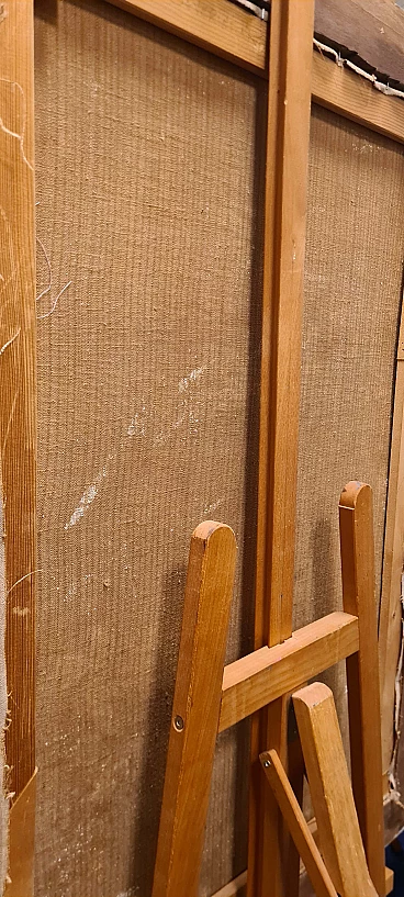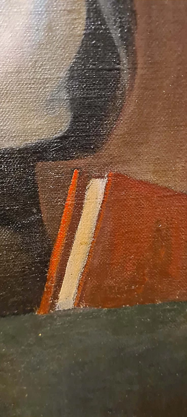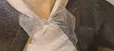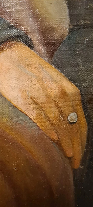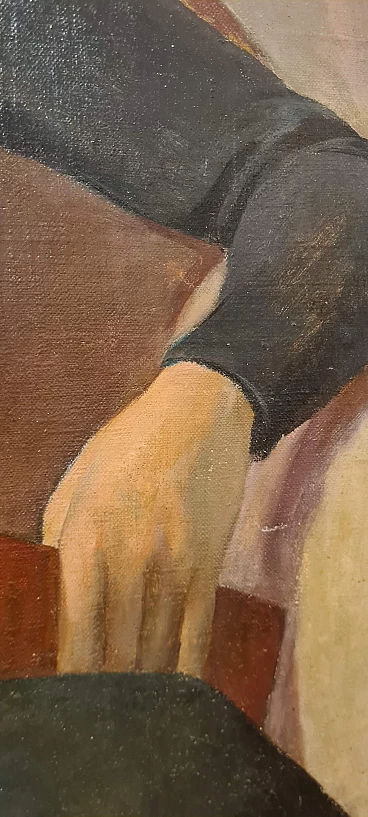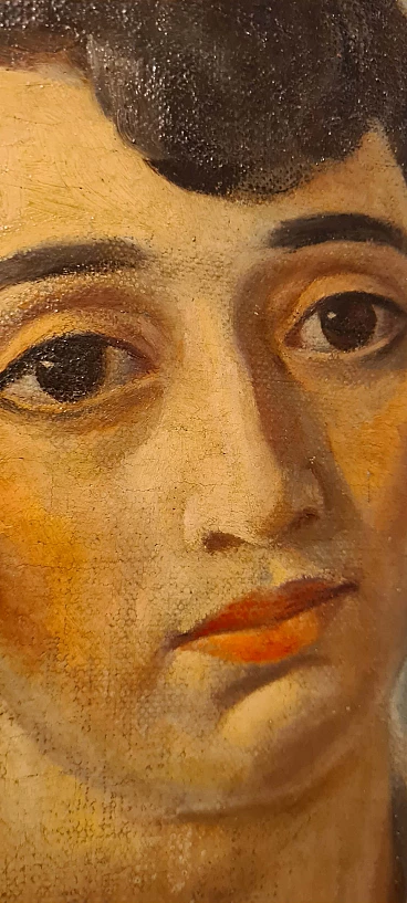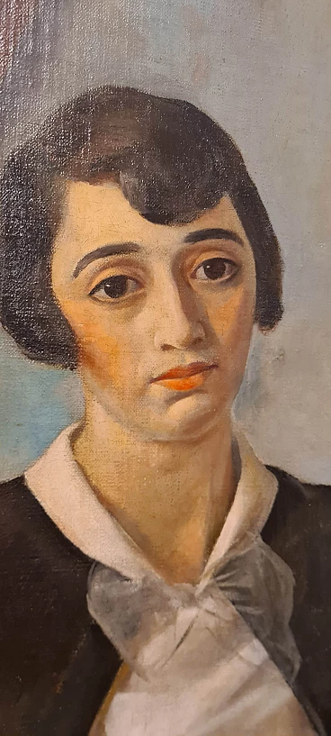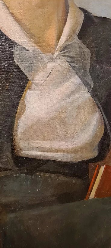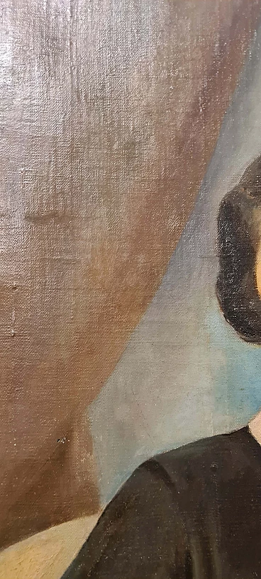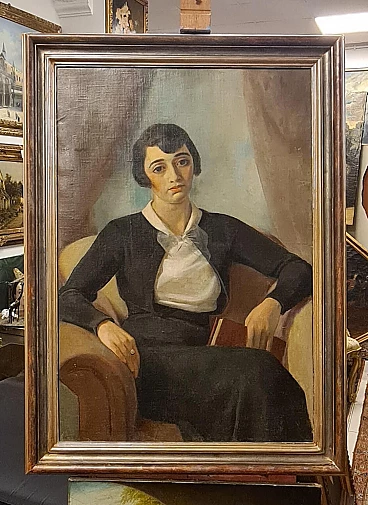 Dipinto a olio su tela raffigurante un ritratto femminile. Lo stile è quello del Realismo Magico tipico di Casorati. È firmato ma indecifrabile; la grande maestria dell'esecuzione però rimanda a grandi nomi della pittura. Non è  datato ma per stile e costumi è collocabile nella prima metà del '900. Questo raffinato quadro ritrae una giovane ragazza seduta e interrotta nell'atto della lettura; lo stile dell'abbigliamento sobrio e della pettinatura è tipico degli anni '40-'50. Lo sfondo è reso da dei tendaggi. La cosa che più colpisce è il volto della giovane donna: l'espressione è seria e al contempo triste, gli occhi grandi mostrano uno sguardo assorto quasi preoccupato e l'incarnato, nonostante sia finemente truccato, appare smunto. Il quadro di per sè sembra statico ma un occhio esperto noterà come l'autore abbia usato un gioco di luci e ombre sulla camicetta che ne rivelano il movimento. Il ritratto ricorda molto per soggetto e stile i quadri dei grandi pittori italiani  della prima metà del '900, come Felice Casorati, Gino Severini e altri. Il quadro si trova in ottimo stato conservativo e non ha difetti.