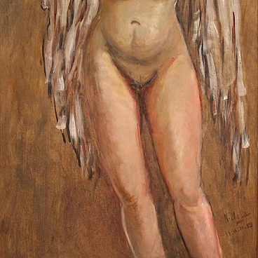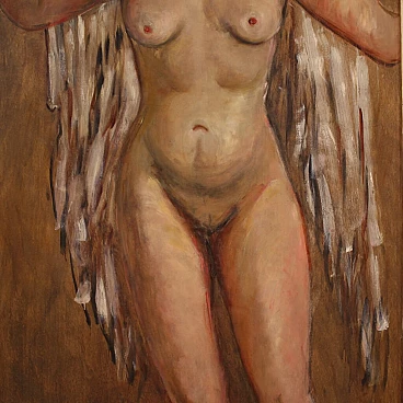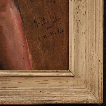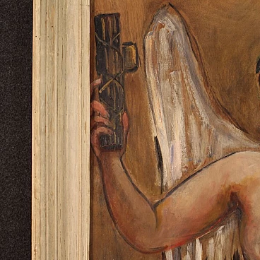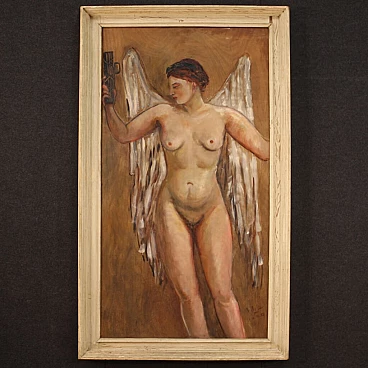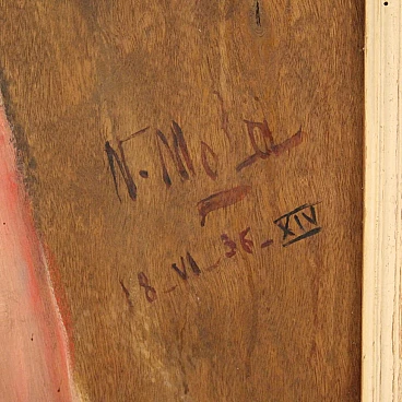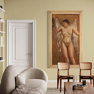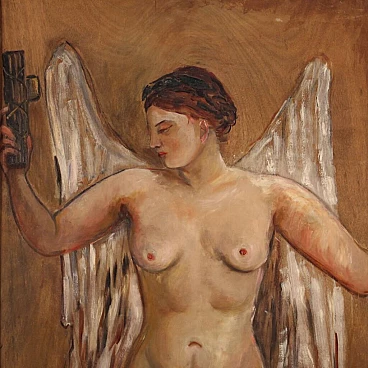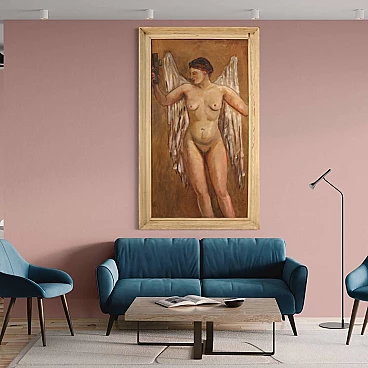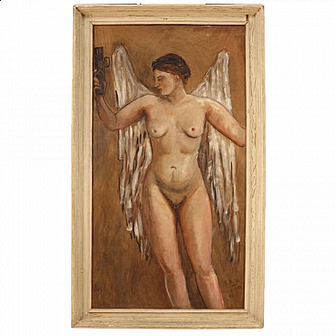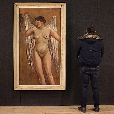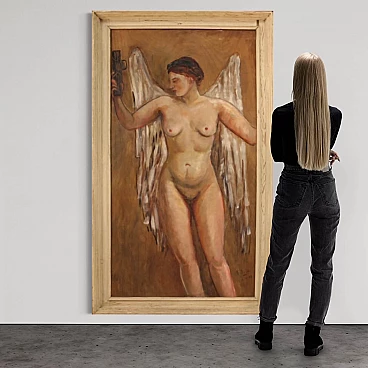 Grande dipinto italiano datato 1936. Opera olio su compensato di eccezionale misura e impatto raffigurante la Vittoria di buona mano pittorica. Dipinto che si sviluppa sul verticale con cornice lignea laccata di bella decorazione. Cornice con qualche segno del tempo (vedi foto), strutturalmente sana. Opera ideale da inserire in un grande salone o studio firmata e datata in basso a destra (vedi foto) N. Mola 1936 riferibile alla pittrice Natalia Mola (1899-1981), mancante di autentica. Dipinto di particolare arredamento, per antiquari, arredatori e collezionisti di pittura italiana del XX secolo. Presenta qualche piccolo segno del tempo, nel complesso in buono stato conservativo. Luce dipinto H 178 X L 96 cm.