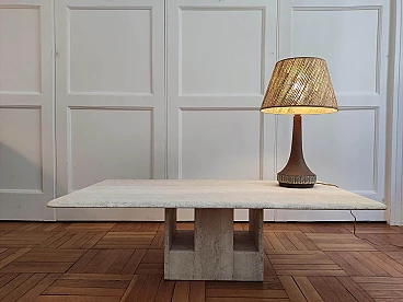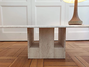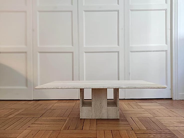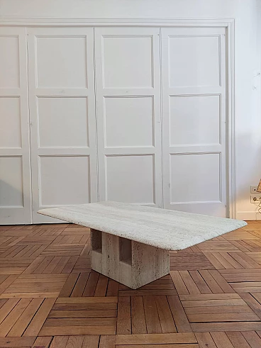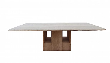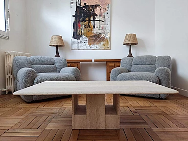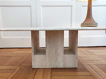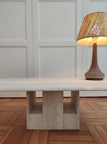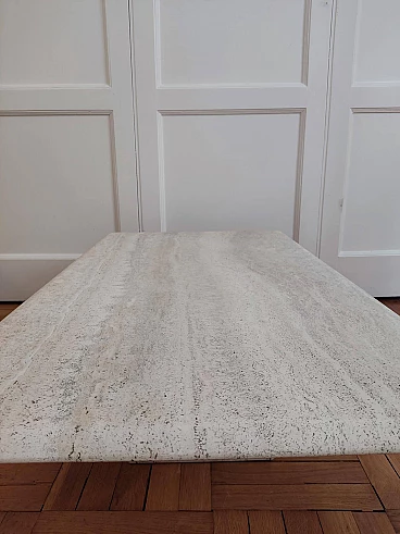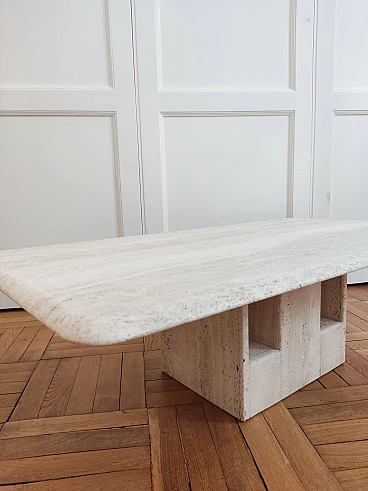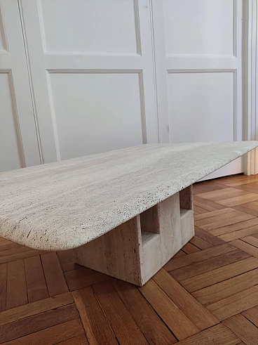 Tavolino in travertino di Claude Berraldacci, anni '90. Piano rettangolare con bordi arrotondati e piede scultoreo; il tutto è costituito da un unico blocco. Questo tavolino proviene direttamente dal designer Berraldacci, il cui marchio si chiamava "La Pierre Haute Couture". La pietra usata è il travertino più puro: proviene dalla cava di Tivoli vicino Roma, da cui sono stati estratti i materiali per i palazzi del Vaticano, il Colosseo e la Fontana di Trevi. Il travertino di questa regione è puro e di colore molto chiaro. La pietra viene lavorata con una grande abilità che la trasforma in una sorta di "travertino ammorbidito", caratterizzato da un aspetto naturale e opaco, quasi morbido al tatto. Questa lavorazione mette in risalto la texture minerale e il colore unico.