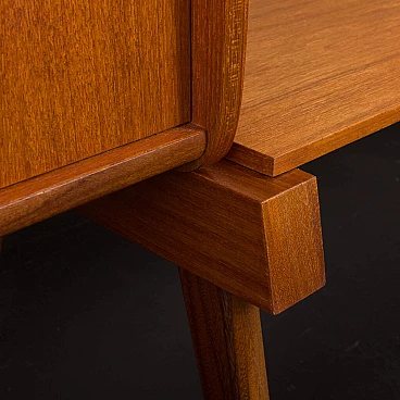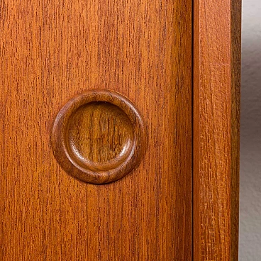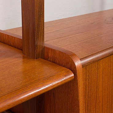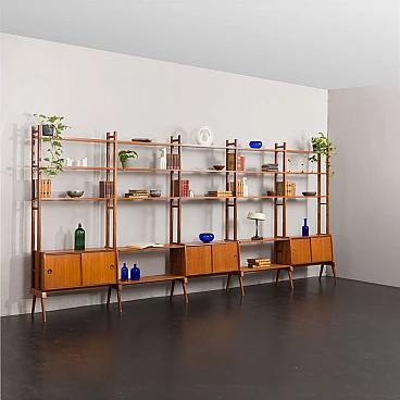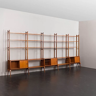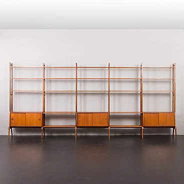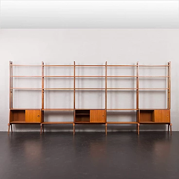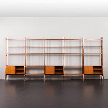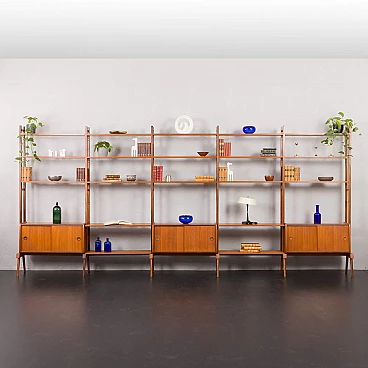 Libreria norvegese in teak a cinque campate, anni '60. Sistema di scaffalature modulare dotato di tre armadietti e diciannove mensole. Fornisce notevole spazio per riporre ed esporre libri e oggetti decorativi vari. Mostra l'essenza del design moderno scandinavo della metà del secolo. I bordi leggermente curvi danno un'impressione calda e i montanti scultorei sono una dichiarazione elegante e di grande impatto. Questa libreria è impiallacciata in teak con dettagli in legno massello come montanti e maniglie circolari. Si adatta perfettamente a un soggiorno o a un ufficio. I supporti verticali e le gambe affusolate e scultoree creano linee geometriche, sottolineando l'origine scandinava. I tre mobiletti con ante scorrevoli sono alti 41 cm, larghi 88 cm e profondi 30 cm. Due mensole sono profonde 30 cm, due 32,5 cm, le altre quindici 20 cm. I cinque montanti sono lunghi 206 cm. È stata interamente restaurata. È un pezzo bello e funzionale in condizioni fantastiche, quasi senza tracce di utilizzo. È autoportante ma consigliamo vivamente di montarlo a parete.