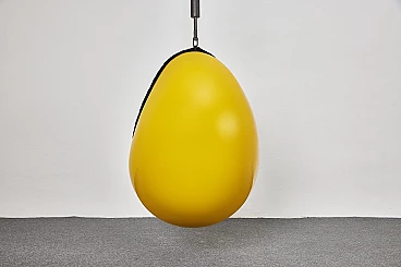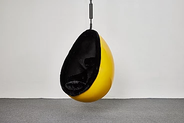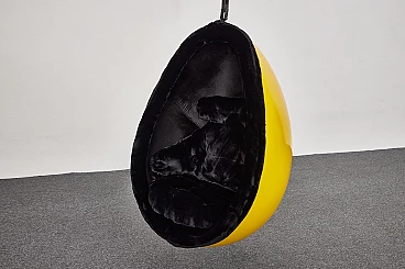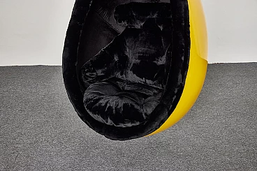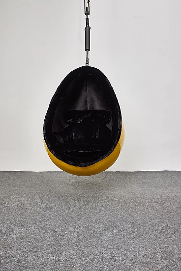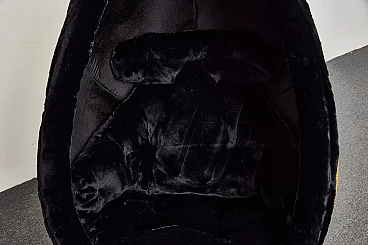 Poltrona a uovo sospesa prodotta da Kare nel 2000 in edizione limitata. Il design è quello del 1968 di Henrik Thor-Larsen. Struttura in fibra di vetro, rivestimento in velluto nero ed ecopelliccia nera. Completamente rinnovata: struttura in fibra di vetro riparata, nuova verniciatura lucida, rivestimenti in velluto e pelliccia sintetica. Capacità di carico massima: 90 kg. Possediamo una poltrona Thor-Larsen originale, quindi abbiamo modellato il cuscino del sedile e lo schienale nel guscio originale e l'abbiamo adattato a questa versione.