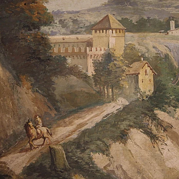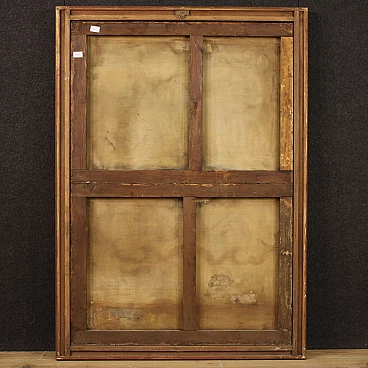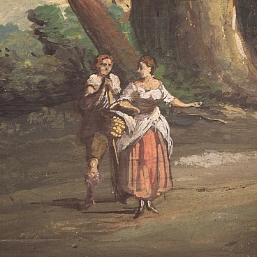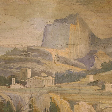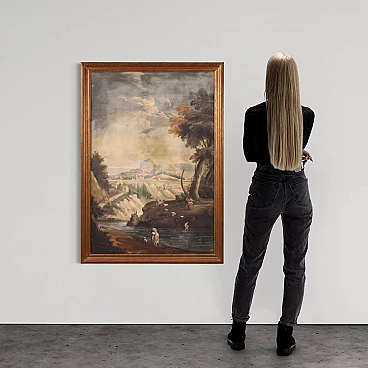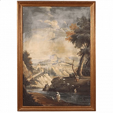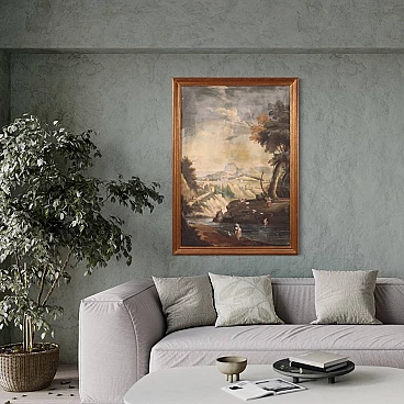 Dipinto a tempera su carta fissata su tela con telaio (vedi foto), fine '700. Raffigurante paesaggio con figure, animali e architetture di buona mano pittorica. Cornice lignea moderna scolpita e dorata di bella decorazione. Opera che si sviluppa in verticale, di grande misura e impatto. Si divide esteticamente in due parti: il grande cielo nuvoloso caratterizzato dalle numerose sfumature di colore e la parte inferiore terrena. Opera di piacevole profondità; molto belle le architetture che si stagliano nel paesaggio di campagna e i personaggi in primo piano sulla riva del fiume (vedi foto). Quadro in bellissima patina che presenta diverse piccole cadute di colore e segni del tempo. Strutturalmente sano, nel complesso in discreto stato conservativo. Misure senza cornice: 122 x 83 cm.